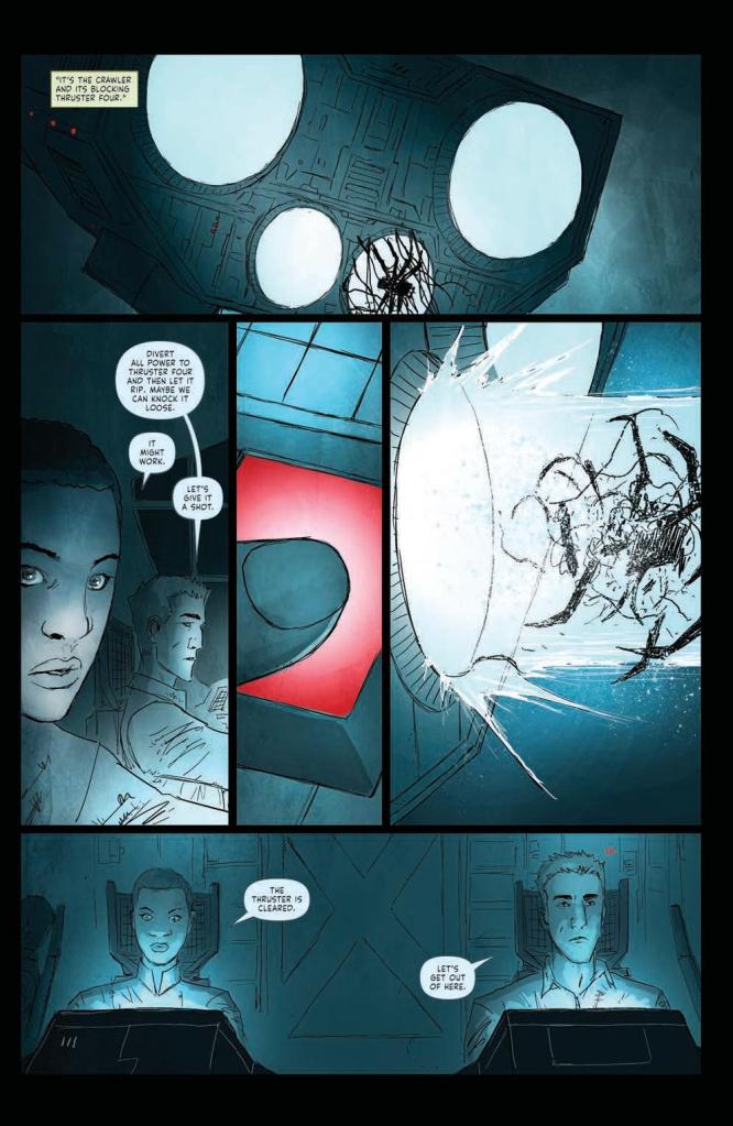 So what does the story bring? To be clear, my thoughts on the pacing haven’t changed much. Each issue feels relatively short, but with a methodical delivery which is adeptly paced to deliver just the right amount of information to keep you coming back. This has the look and feel of a good sci-fi movie. The sparse but effective delivery of lines, the claustrophobic feeling (impressive given the amount of space the ship seems to have), and, of course, the aforementioned pacing for effect.