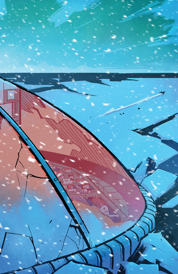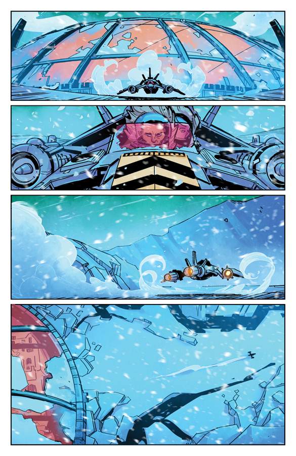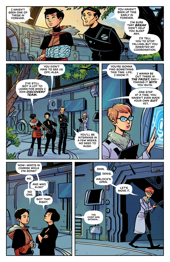 Life still goes on no matter where you are in the world. Or, for that matter, the universe. Outpost Zero, a unique little sci-fi gem premiering with issue one this week, demonstrates that fact in more ways than one. It doesn’t matter if you’re in a British suburb, the middle of a Pennsylvania state, or, in this case, the descendents of a space colony that crash landed on a barren frozen wasteland of a planet and spent generations trying to join the rest of the human race. Kids will still be kids.