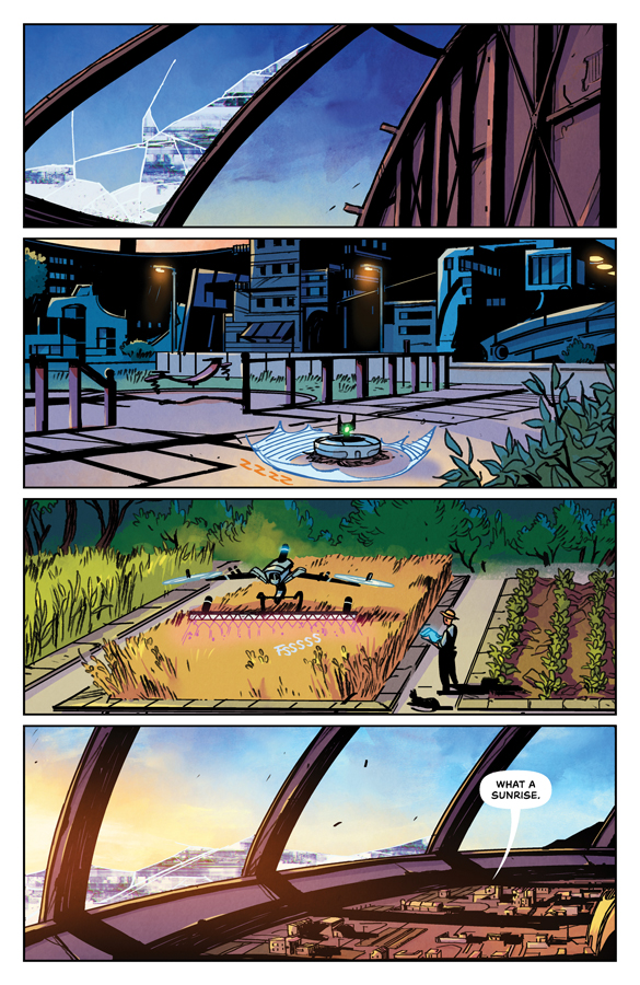 All with the fascinating Aliene-sque backdrop of a wonderfully drawn setting, the bright colours popping out the page against dark inked shading, culminating in what the author summed up beautifully, “An ending and a beginning, both of them forming at once, separate yet entangled.” Outpost Zero is well worth a look if you’re in the mood for beginning a new journey into the stars through a familiar pair of teenage eyes.