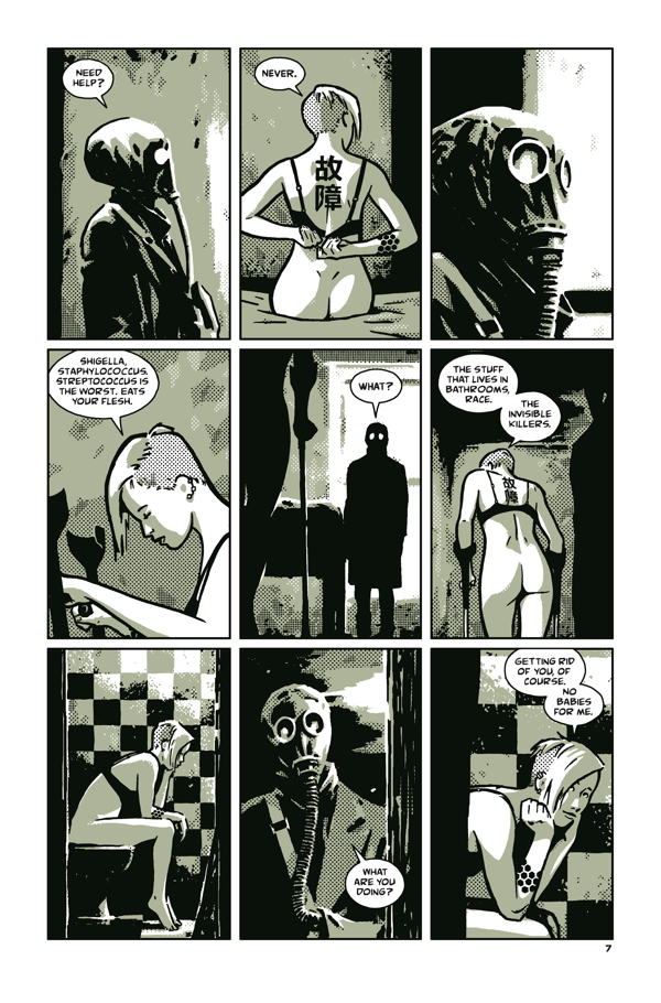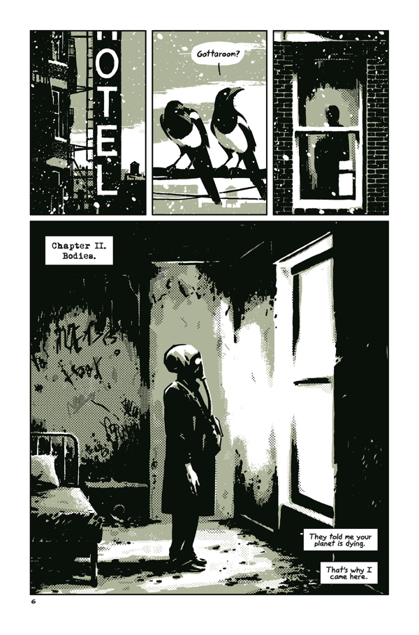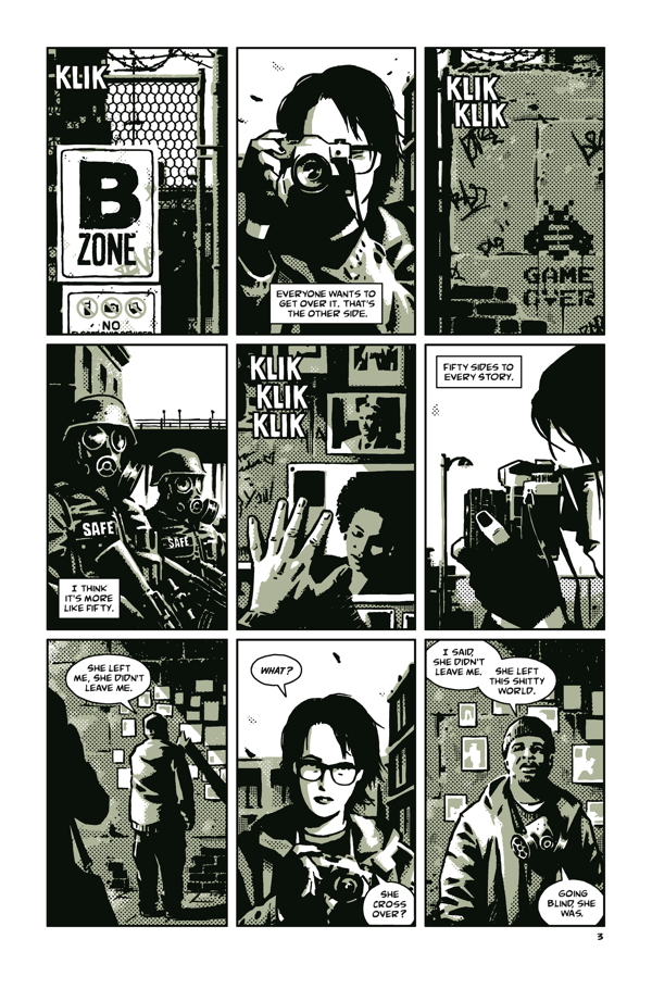 Throughout the course of the first issue we get to find out a little more about this doomed version of Earth and the aliens who are living in secret amongst the human population, extracting and cataloguing its many biological treasures before it’s all too late. We also get to find out about the technology exclusion zone that has been set up, serving as both an alluring prospect and a focal point of frustration for the world’s increasingly disillusioned inhabitants. Along the way we’re also introduced to a few key players in the coming story, including journalist Astra and wheelchair-bound Lola, the latter of whom is in the midst of a fling with one of the aforementioned aliens.