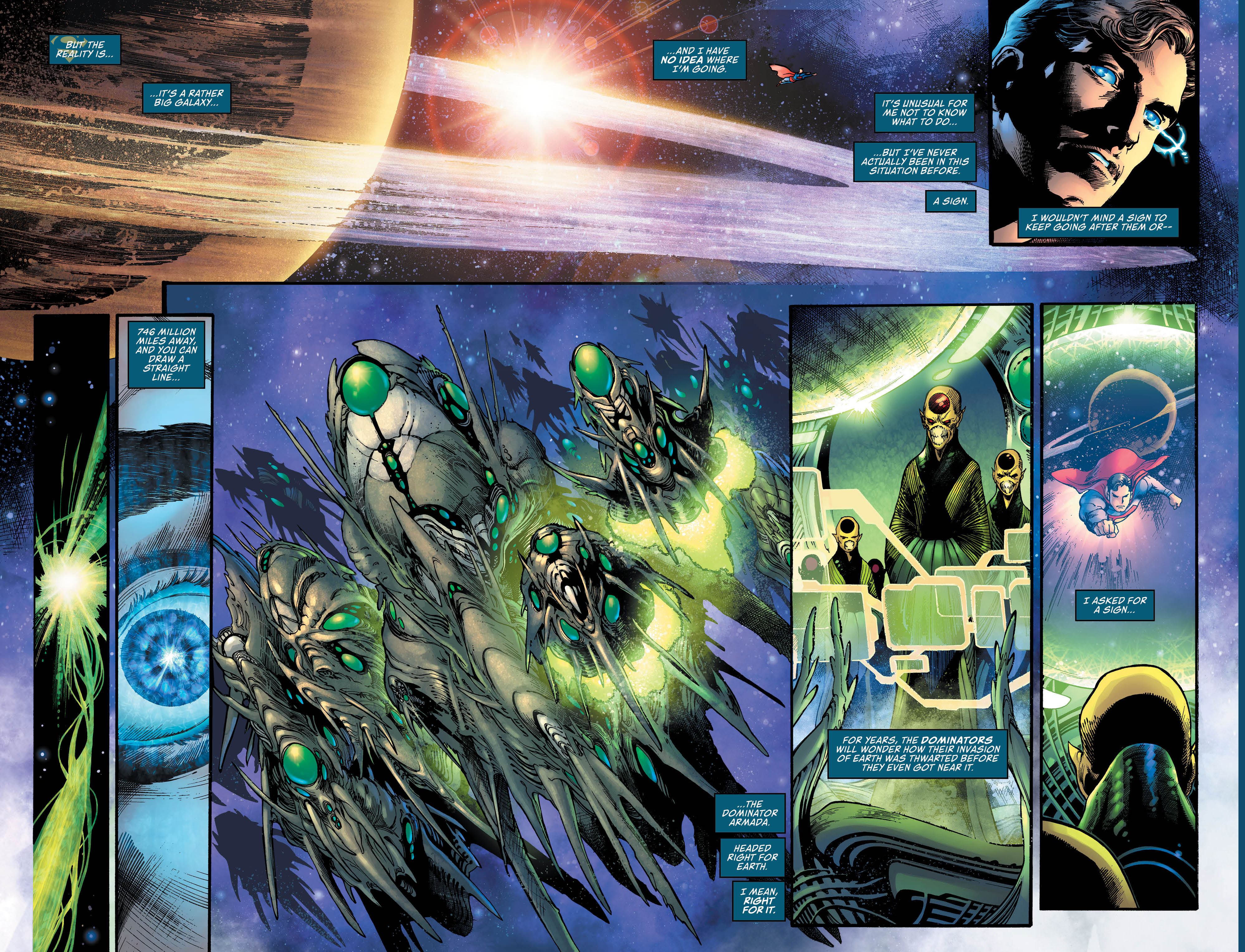 We know how strong and fast Clark is and this issue really helps place the emphasis on that particular aspect of the Man of Steel as, en route to finding Lois and Jon, he makes light work of an entire fleet of Dominators. While having a conversation with one of his Justice League compatriots, he darts backwards and forwards to various disasters around the world, never missing a beat in the process.