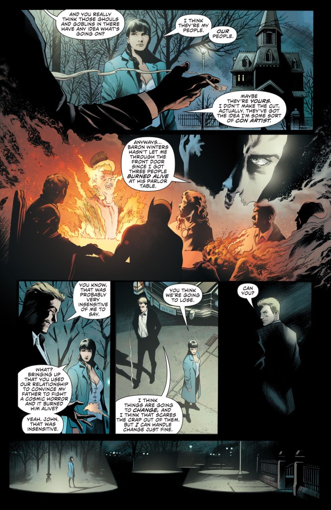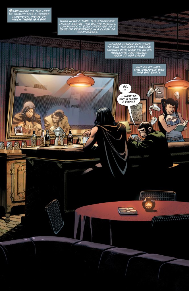 As for the rest of the team? Well, Zatanna’s involvement feels far more comfortable, and she’s always been a character I’ve enjoyed reading so it’s great to see her featuring so prominently in the overarching story. Detective Chimp is an addition to the roster that, I’ll admit, initially made me a little apprehensive. Not knowing anything about the character, he looked like he was going to be a cartoony dose of comic relief, but I’m pleased to report that Tynion IV presents him as anything but, with a slightly tragic backstory and a straightforward, matter-of-fact delivery that believes his ‘primate Sherlock Holmes’ appearance. Manbat fulfils the Clayface-esque ‘villain seeking redemption’ role in the team, adding some unexpectedly humorous beats along the way. Oh, and Swamp Thing is there too, which is pretty much all I needed to convince me to pick up this book from the moment the roster was released.