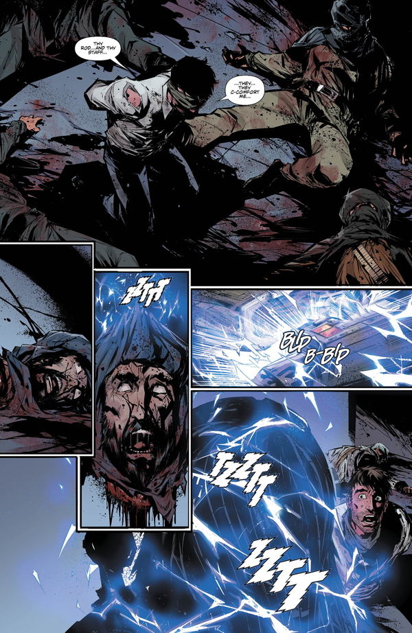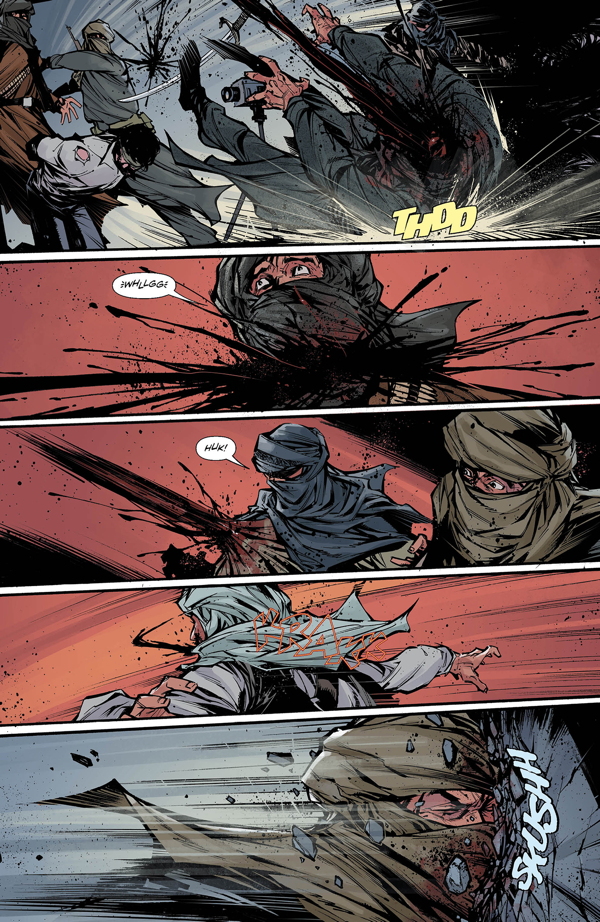 Artist Agustin Padilla does a tremendous job on the visual side of the book, delivering some scratchy, kinetic action panels as the Predator cuts a swath through the insurgents during the opening of the issue. The characters are suitably expressive, and there’s a distinctly cinematic approach to his layouts that obviously works rather well with this franchise. Neeraj Menon does a great job on the colours, keeping things impressively clean and crisp throughout — particularly the outdoor scenes in Afghanistan.