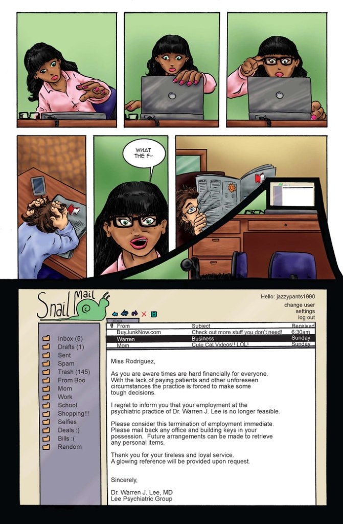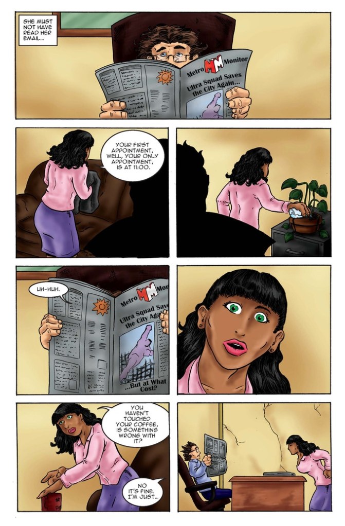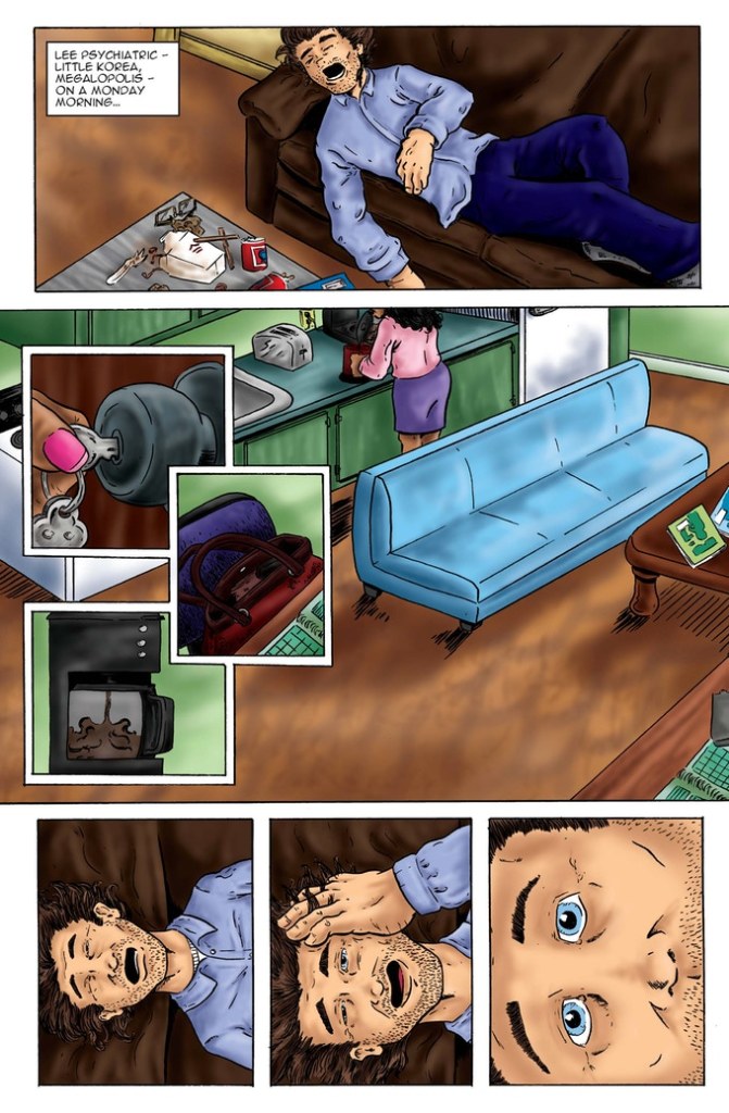 The first two issues follow the exploits of Doctor Lee, a down-and-out psychiatrist, as his life rapidly falls apart leading him from one weird event after another. It starts with him firing his assistant/girlfriend who then trashes his office, which leads into his one and only client – a man who suffers from severe OCD – describing how he can’t function at work because he’s better than everyone and how they mess with him because of it. While this is happening a superhero throws a robber through the door of the practice and takes a selfie with the promise that he’ll tear Lee’s arms off if he sells the picture to the media.