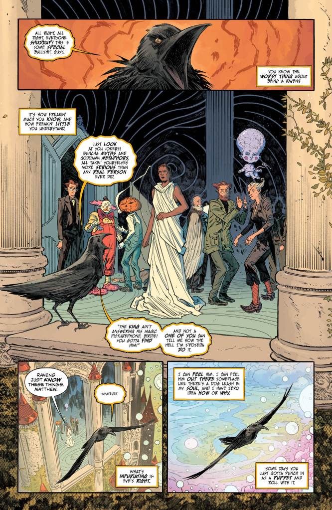 THE SANDMAN UNIVERSE continues this theme impressively. Daniel the Dream Lord has disappeared, leaving the dream realm to descend into destruction. We see the search for Dream through the eyes of Matthew the Raven as he traverses through the worlds in search of his master, quickly learning that there’s more to this than Dream’s brief vacation from his duties. Yet again these eternal creatures deal with the same emotions we do every day, amplified by the fact that they have an eternity to process them. We don’t like being lied to, we rebel against our parents in sometimes extreme ways, we can’t always contain parts of our personality, and sometimes, when the pressure of obligation falls on us all we want to do is run away. Gaiman continues to create storylines that make these omnipotent gods into relatable characters.