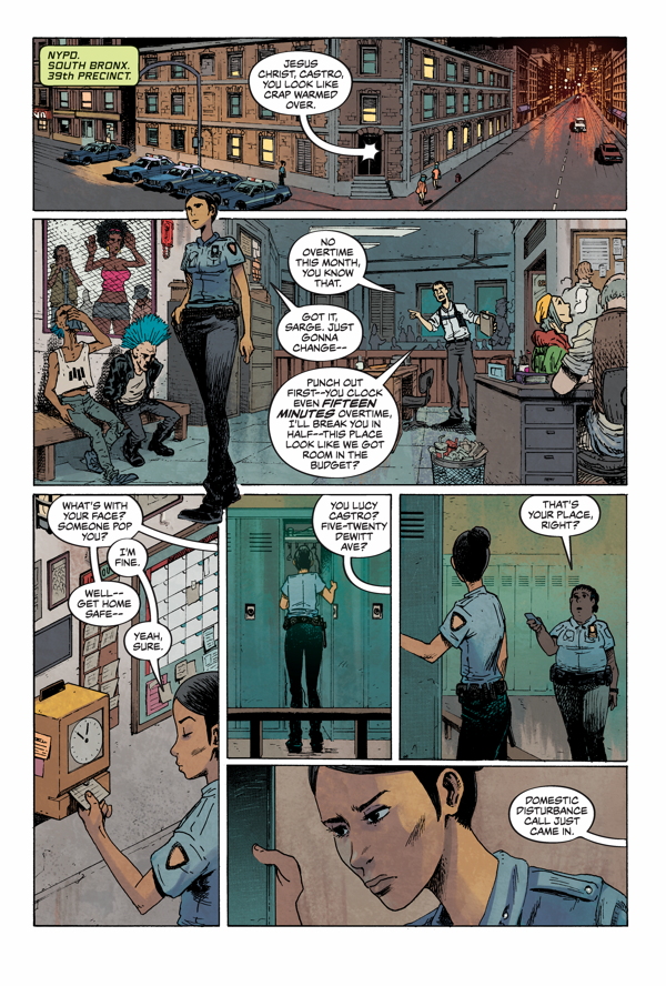 The setting of New York for one gives the story its own unique feeling, calling back to Predator 2 or Die Hard With a Vengeance. The inhabitants and dingy scenery add a darker tone with its own smart-arse sense of humour to the events which are unfolding, with Jeff Stokley’s use of angular jaws and glaring eyes creating a far more menacing Terminator than the familiar Arne death stare. Castro is an interesting lead too, and she strikes me a little like a combination of Kyle Reese and Connor. Not just the damsel in distress but someone whose seen the bad side of society already, and who is still very much a woman without the slight masculisation of Sarah in Judgement Day.