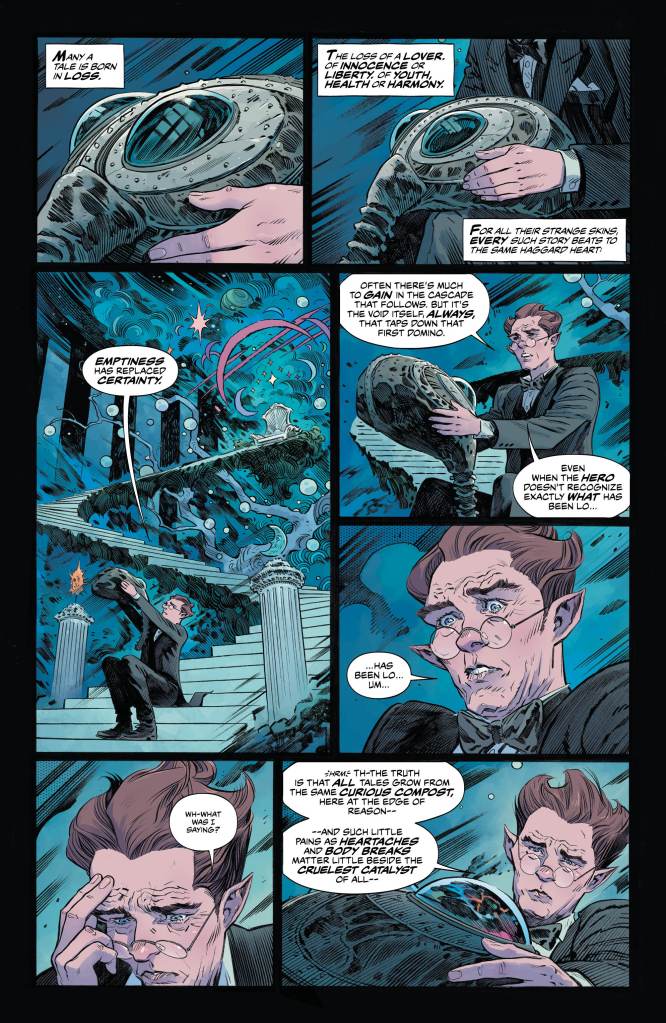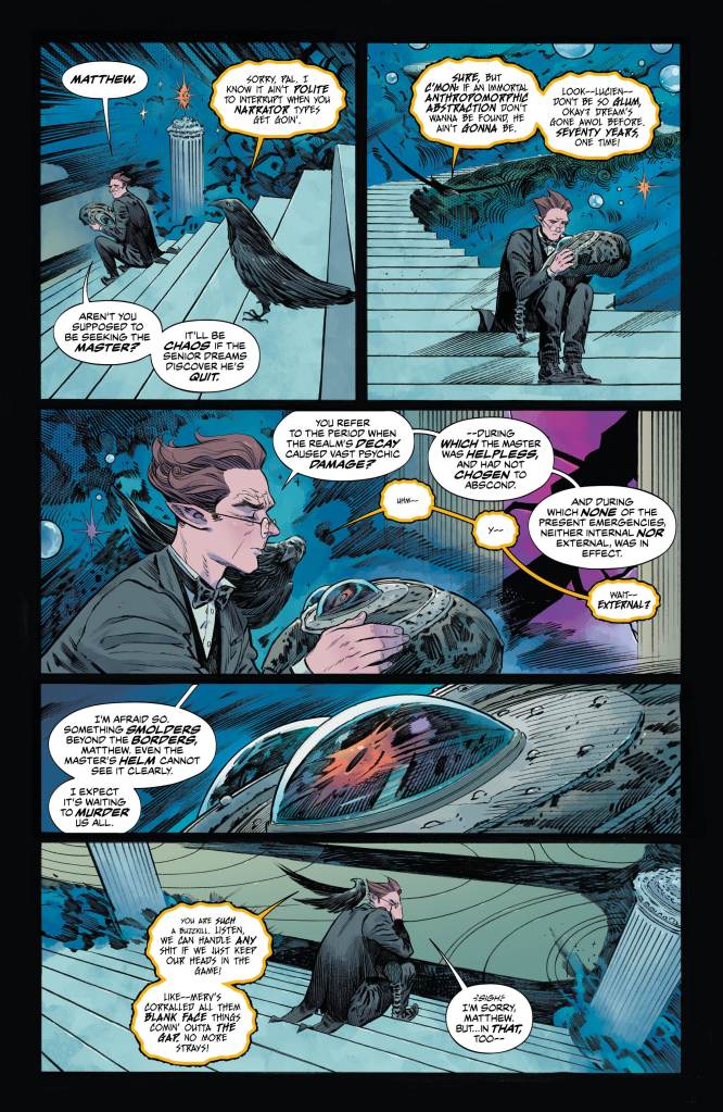 Here, the narration has shifted this time from Mathew to the poetic Lucien, the librarian and somewhat curator of the dream realm’s library. Introducing the issue, he tells of the ongoing problems caused by his master’s absence in a way that only one as educated as Lucien could put it.