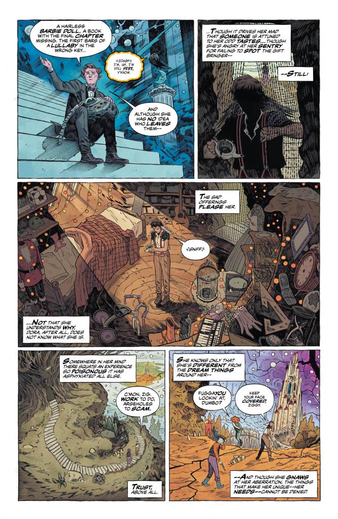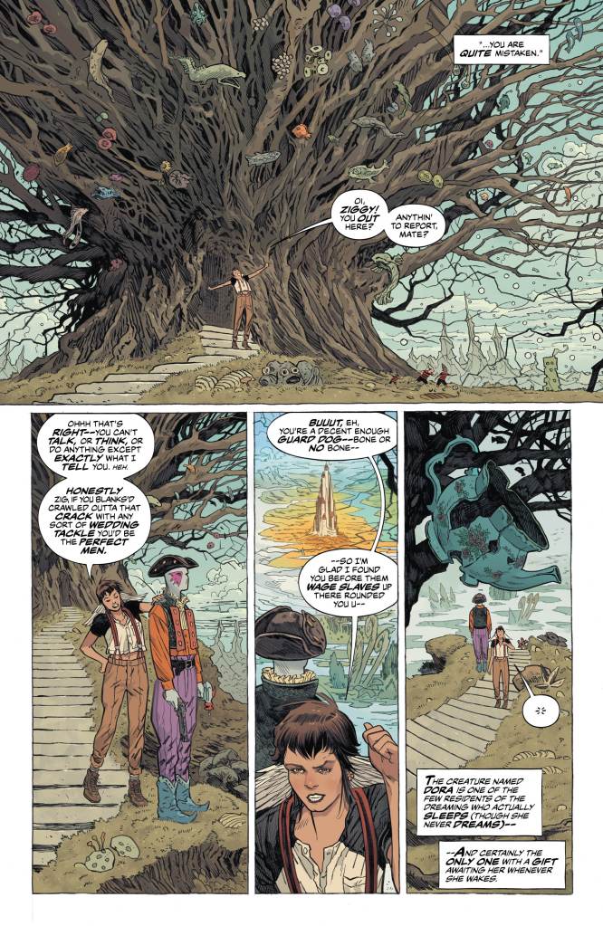 All but one, that is. The mysterious Dora, a (mostly) human picked up by Dream a long time ago for some unknown reason with abilities and needs that none of the other creatures possess. In a great nod to the Bowie-esque feel of the Universe she’s stolen one of the faceless and named it Ziggy, even painting the familiar colourful lightning bolt across the eye. And while she is content to traipse across dreams foraging for food and fornicating, her actions might end up putting the entire realm at risk.