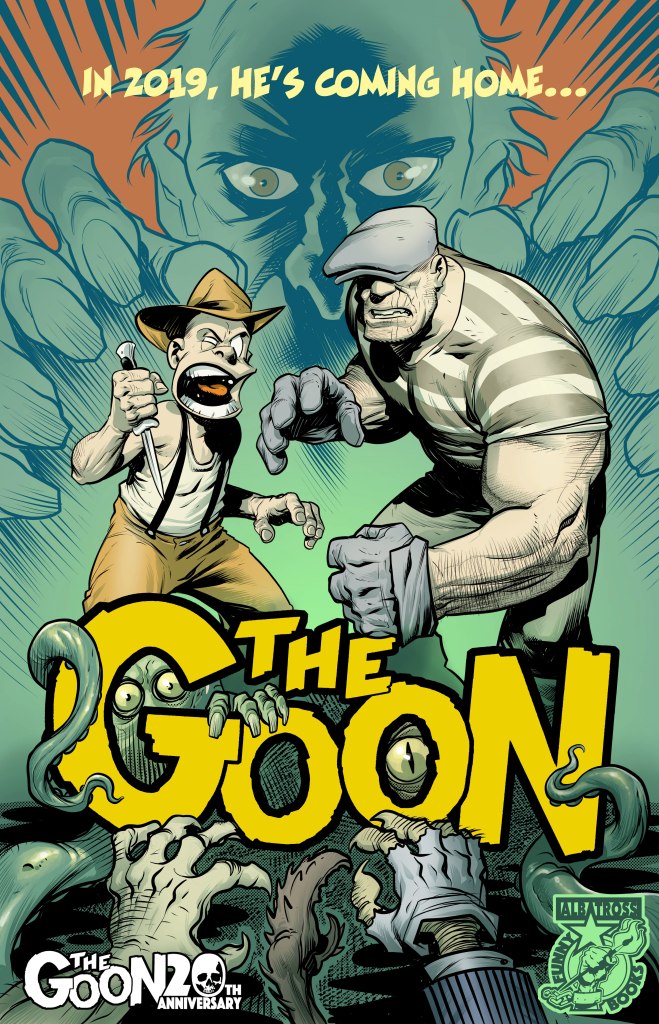 In 2019, award-winning cartoonist Eric Powell and his publishing company Albatross Funnybooks will debut an all new GOON comic book series, featuring never-before-published stories. For almost two decades, the Goon’s whiskey fueled adventures have thrilled fans, critics, and creators with their bold creativity, classic style,and irreverent humor. When Albatross Funnybooks debuts THE GOON #1 next spring, it will mark the first new Goon stories to be published since Dark Horse published THE GOON: ONCE UPON A HARD TIME comics in 2015, and it will kick off a year-long, 20th anniversary celebration featuring a national signing tour, Albatross Funnybooks’ collected editions of classic GOON graphic novels, limited edition GOON tiki mugs and more.