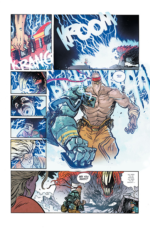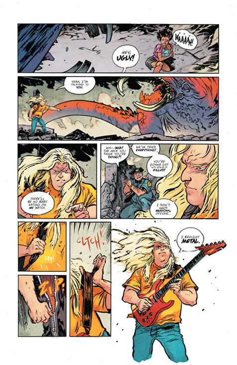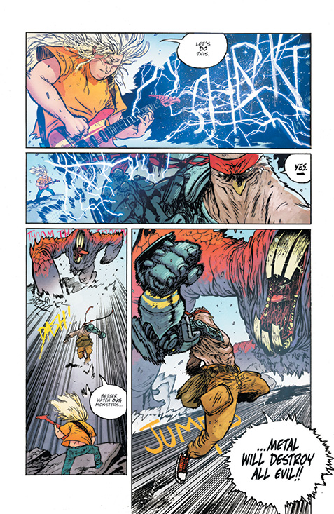 I enjoyed the hell out of this comic. It feels like Daniel Warren Johnson’s interpretation of a Tenacious D album mixed with lashings of Bill and Ted and a dash of One-Punch Man, full of action, ridiculousness and a bloody cool concept. It hits the sweet spot for readers who either have a sense of ‘80s nostalgia or a love for rock or metalocalypse, combing the love of head banging with over-the-top heroes and gory space aliens.