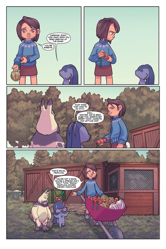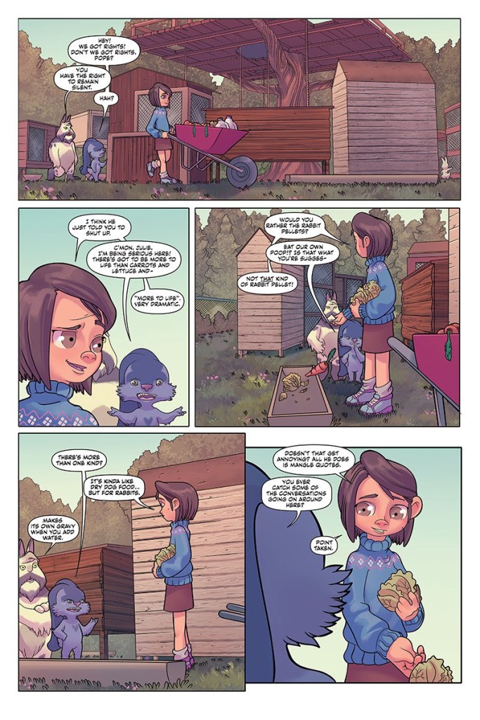 One thing that’s clear from the get-go is the fact that Giffen and Roman are clearly having an absolute blast, with the bulk of this opening issue being devoted to an amusing drawn-out conversation between Julie and some of the rabbits in her care about the different types of rabbit food that are available.