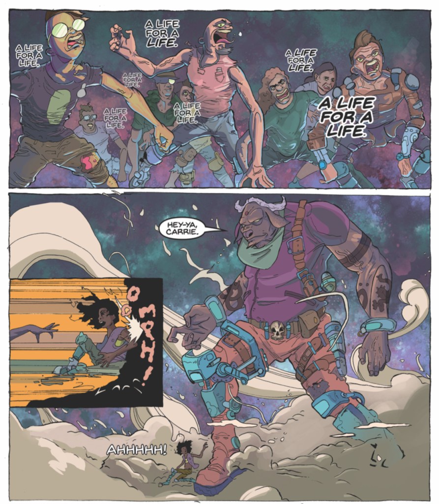 This latest issue does a great job of investing the reader in this new character Carrie, and through her eyes we get to see the damage her past has had on her and the clear signs of PTSD that continue to shape her world and the world around her. It gives the comic an even more alien feel to it which does the illness justice (not falling into the trap that pop culture tends to by making the condition into a gimmick) by blending it well with the already barren and horror-filled setting of the story. Oh, and just as you start to think it’s all in her head the action comes out of nowhere bringing gory danger to the family, igniting the pursuit even further.