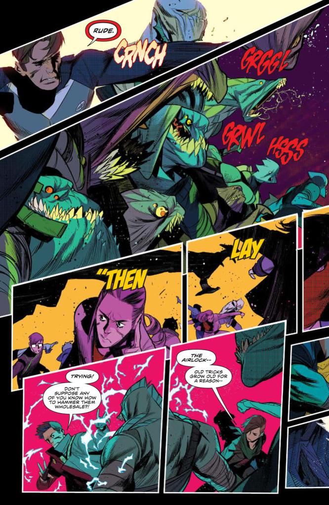 Colour also plays a significant role in this issue. The bright colours of our Rangers contrasts brilliantly with this new dark, muted world that this makeshift team finds itself in. They genuinely feel like they don’t belong, and that uneasiness is felt through the whole book due to Baiamonte’s sterling efforts.