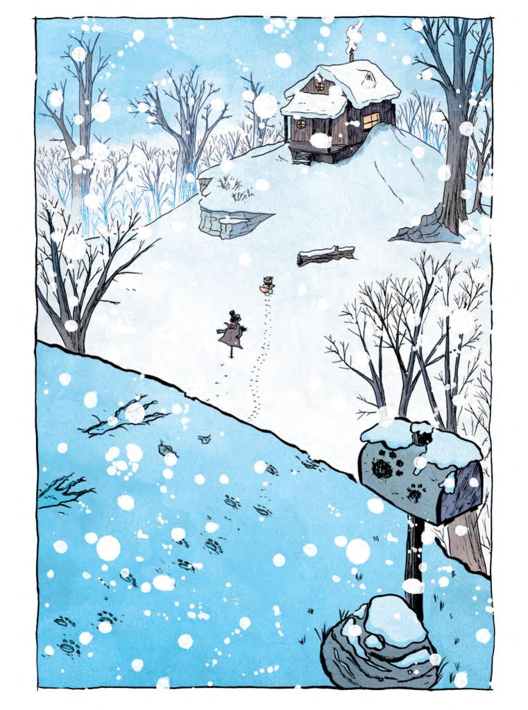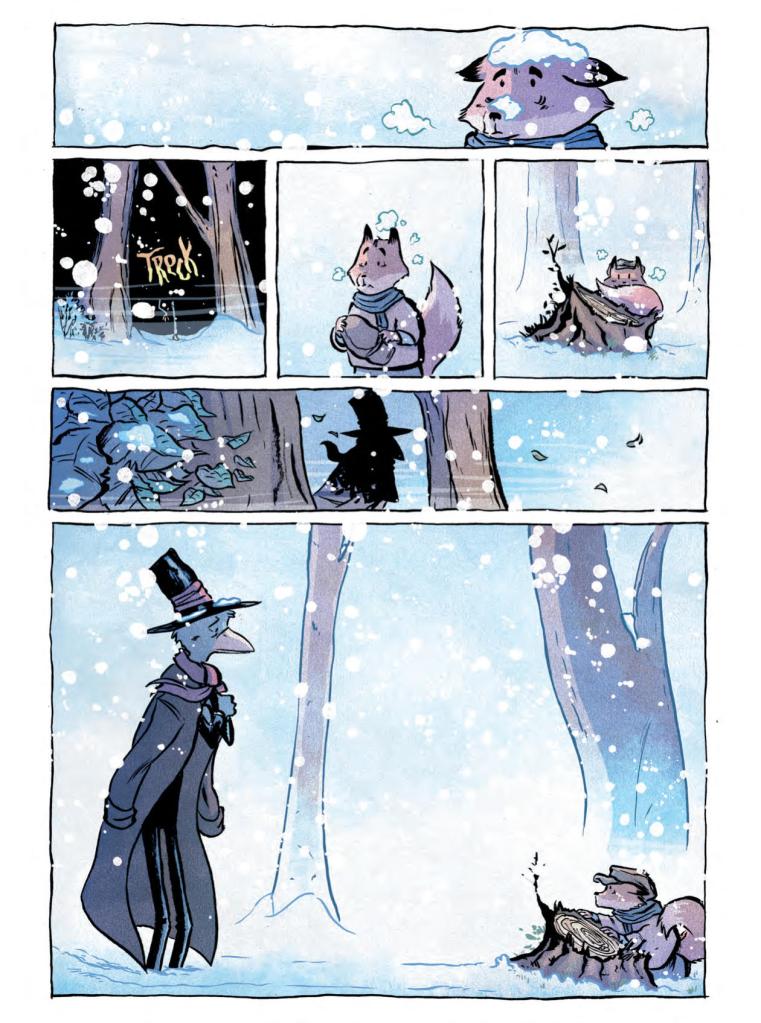 PETALS, a new original graphic novel from the KaBOOM! imprint of BOOM! Studios, is a remarkable achievement. Over the course of its 32 pages, cartoonist Gustavo Borges tells us the story of a mysterious bird creature who happens upon a pair of foxes – a father and son – in the winter woods, taking it upon himself to help them out.
