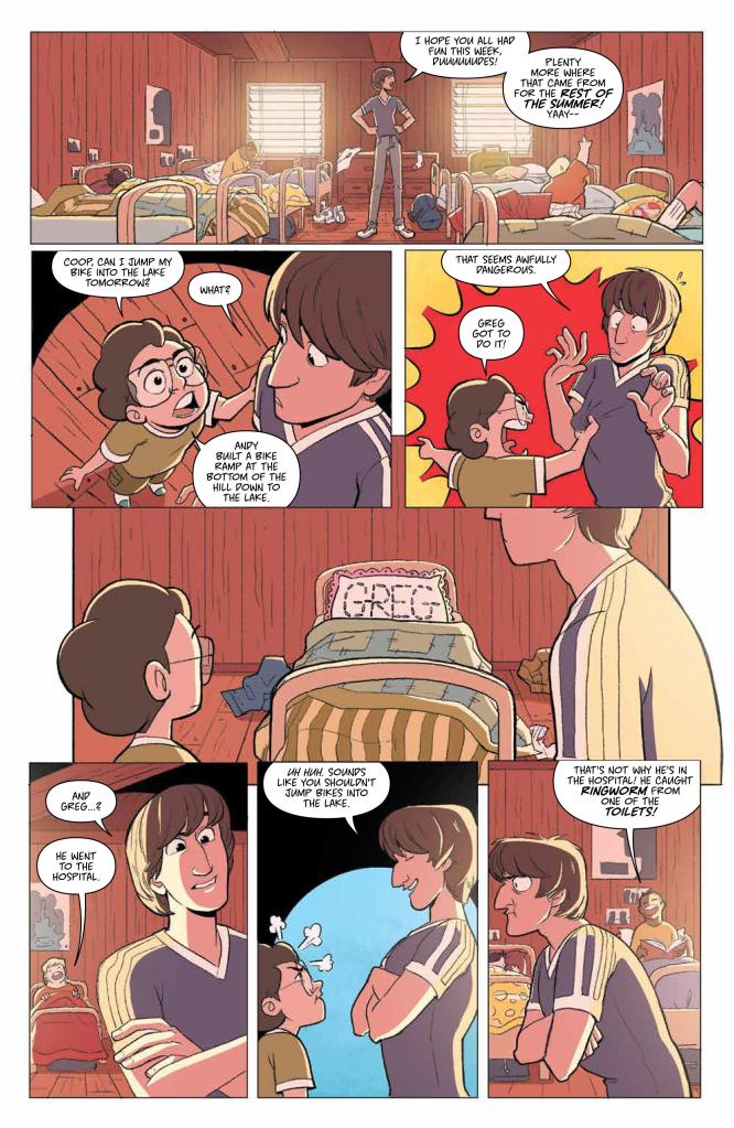 Now the franchise is branching out in the world of comics, with an original graphic novel from writer Christopher Hastings (Deadpool) and artist Noah Hayes (Goldie Vance) on sale now from BOOM! Studios. The story sees the increasingly wild antics of the Camp Firewood counsellors triggering a surprise camp inspection, and the team being given 24 hours to clean up their act before the whole place gets shut down. It’s your typical ‘80s/’90s summer camp movie fare, albeit with a slightly more raunchy and profanity-laced approach, which is essentially the main appeal of the live-action source material.