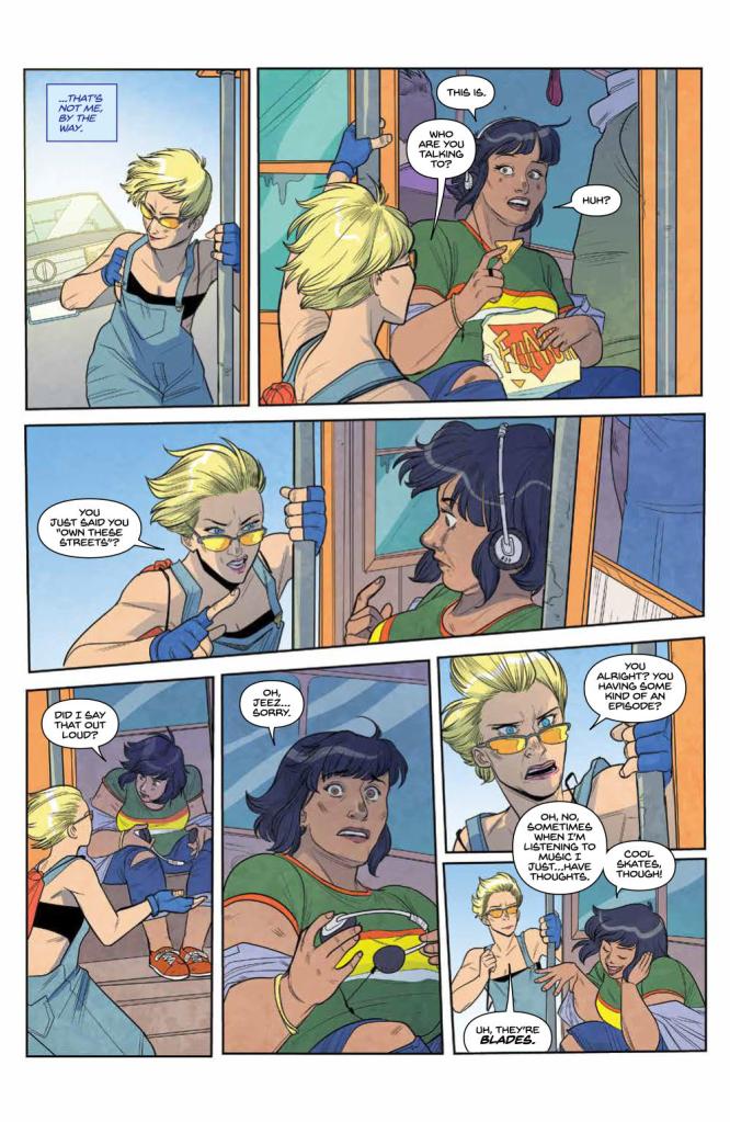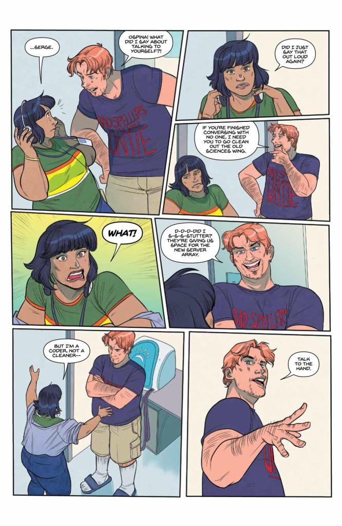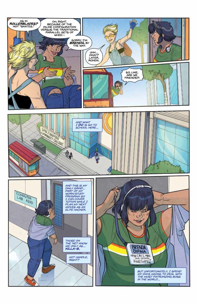 It’s all quirky charm and soft, cartoony artwork to this point, which is great for an imprint like BOOM! Box, and Kiwi and Kurt’s gift for amusing dialogue shines through over the course of this first issue. Brenda serves as a likeable enough leading lady, and her inability to keep her inner monologue ‘inner’ provides some chuckle-worthy moments. It’s also great the way Kurt and Kiwi make sure that she doesn’t come across solely as a clueless dork, showing exactly how capable and talented she is as she uses her hacking skills to completely out-manoeuvre the fleeing Mia.