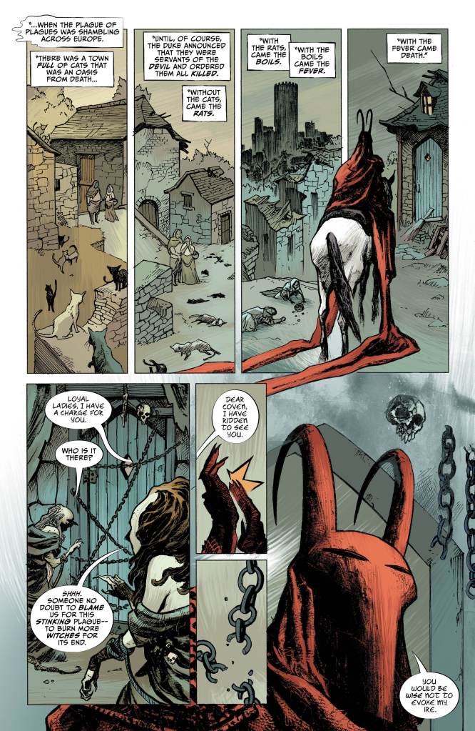 In a simply beautiful set of scenes we learn of the two witches’ connections to Lucifer, a series of scenes that I have to say provide one of the most beautiful and haunting portrayals of Lucifer in the entire history of the character. The feeling of there being puzzle for the reader to figure out continues here as we’re drip-fed information, almost like every page is another page of evidence in a huge dossier of unsolved crimes. But these pages are sent to you gift wrapped in that quintessential Sandman style, with Max and Sebastian Fiumara and Dave McCaig delivering beautiful images of these well-known characters in haunting scenes covered in blood, gore and Gothic architecture.