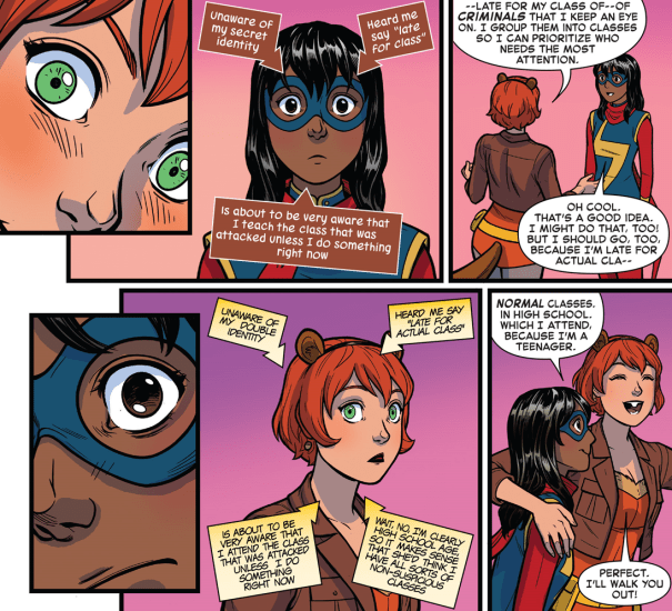 Older readers may perhaps find it a little slight, but then again they’re not exactly who it’s aimed at, so that’s probably to be expected. Some of the cameos and guest appearances do perhaps feel a little shoehorned in, with American Chavez and Inferno adding little to the proceedings, and I can’t help but feel that the story would feel a lot crisper if it were just based around Kamala and Doreen. That said, the reveal of the aforementioned villain reveal near the end t fits perfectly with the tone and content of the story to the point where I’m almost mad at myself for not anticipating their arrival sooner.