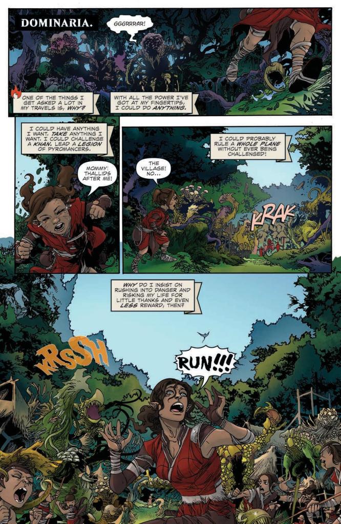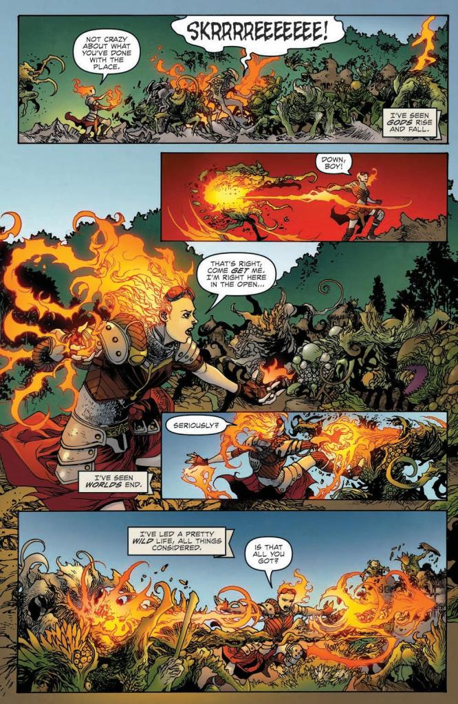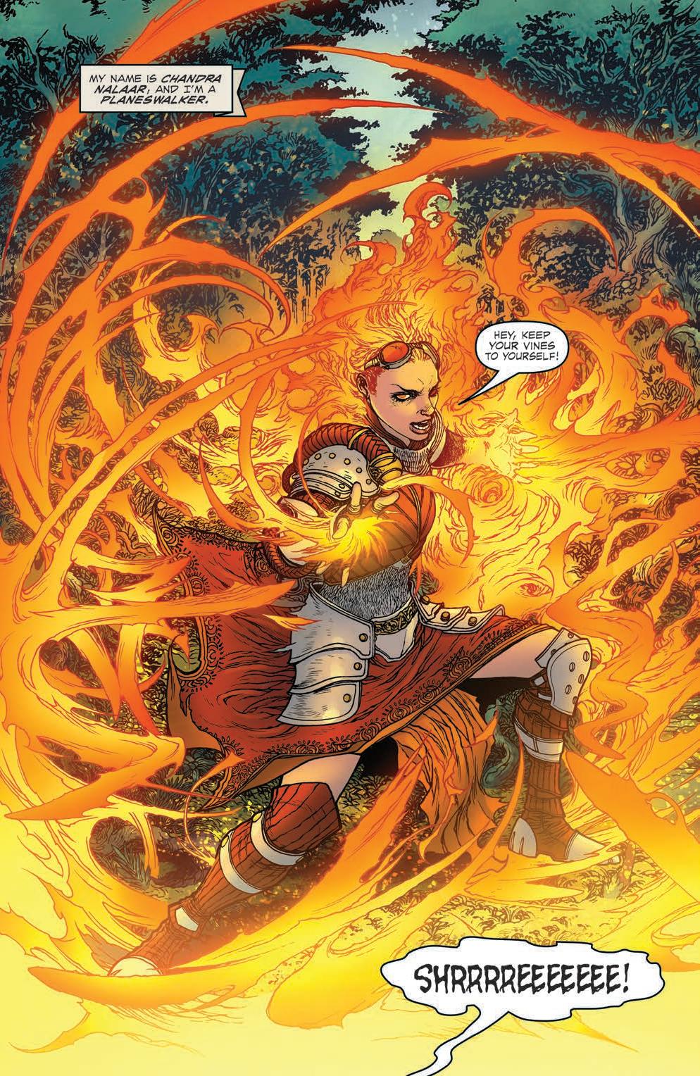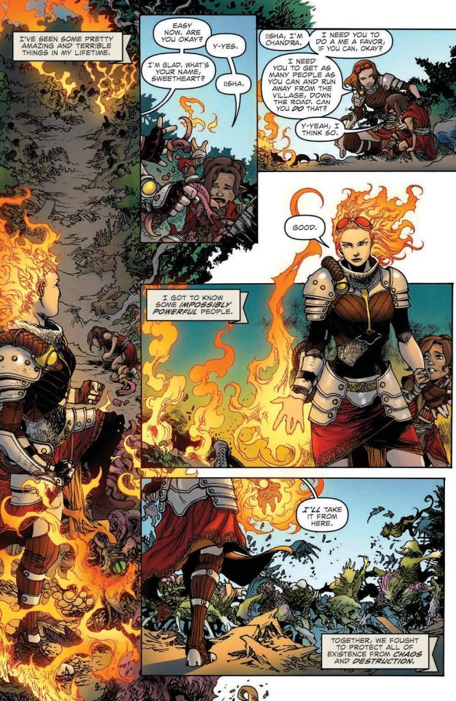 Chandra Nalaar is a Planeswalker, which basically gives her the ability to travel between worlds, along with a mastery of fire which she uses to devastating and stunning effect here. Writer Vita Ayala’s story is clearly still in its embryonic stages, with the bulk of this first issue concerned with introducing readers to Chandra, her outlook and her impressive set of skills. That’s not necessarily a bad thing though, especially for new readers like me who may need more of a gentle introduction into this particular world.