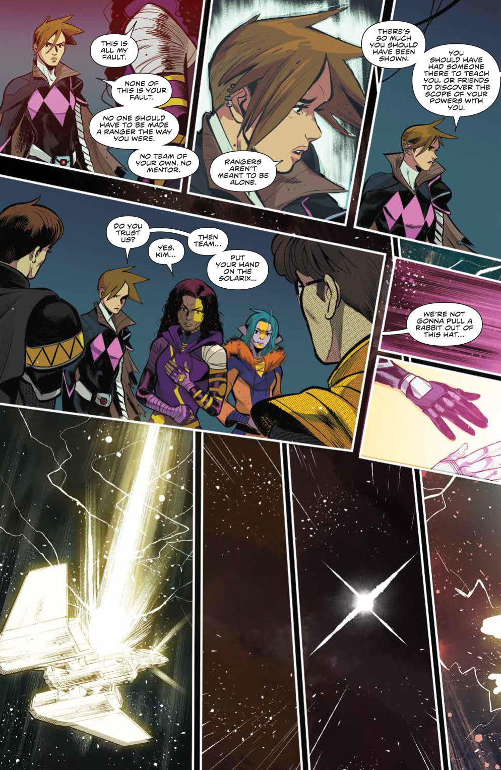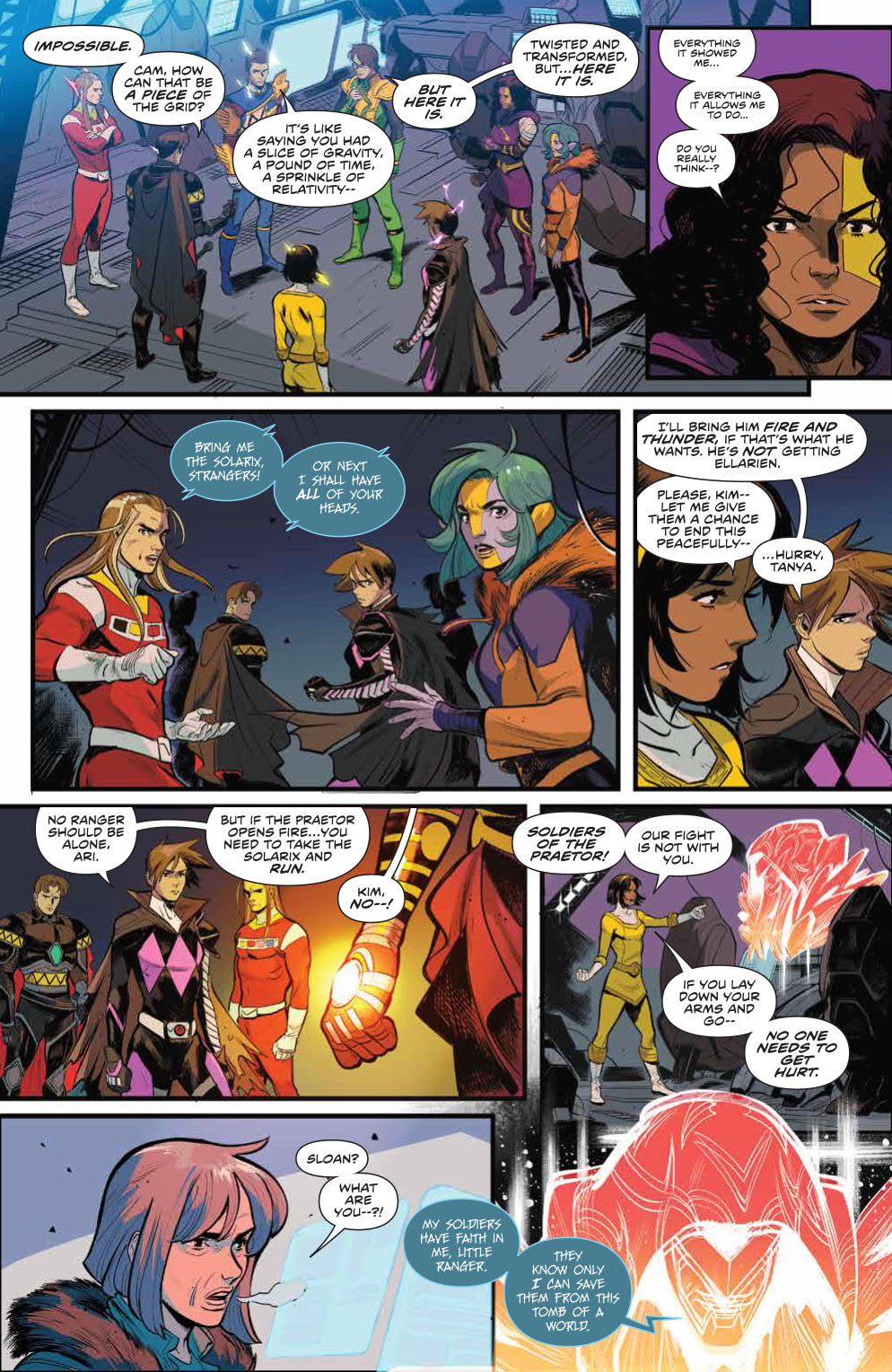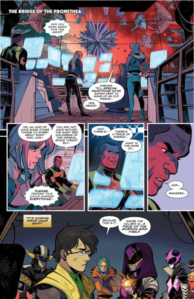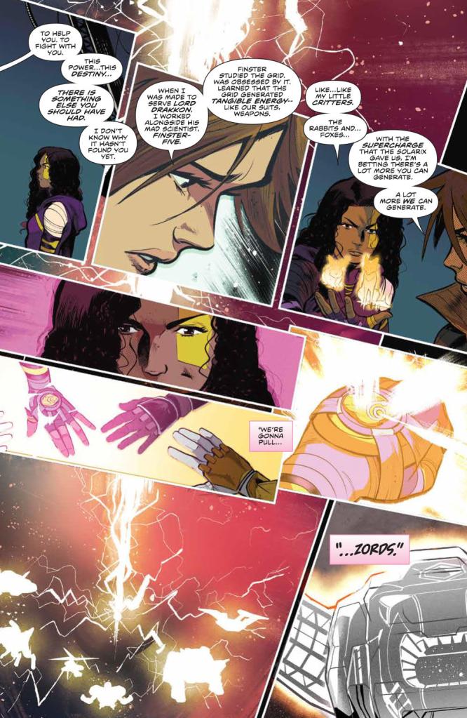 Okay, here we go. It’s time for the first battle with the new big threat to our Rangers: The Praetor. As such, we go all-out here with the Rangers summoning their Zords from Morphin Grid energy. Everything they do here is in attempt to protect the Solarix which, based on the reveal of its origins this issue, is looking to be the main plot device for these Rangers.