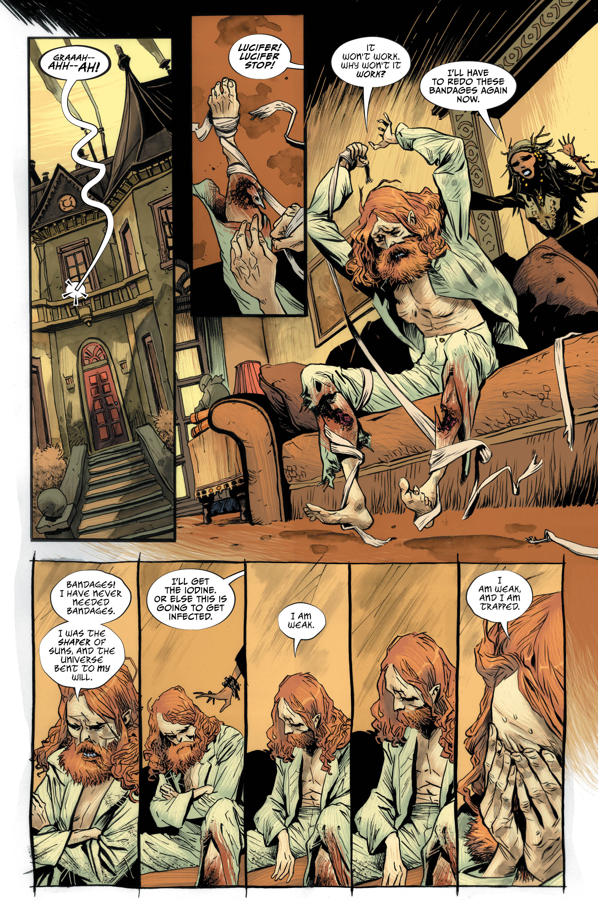 Lucifer continues to astound me with every new issue, revealing new insights into the title character while continuing to tease me with the fresh mystery of how he once again fell from the great heights he occupied when we last saw him. This issue sees the injured and blinded Lucifer once again trying to dig his way out of this weird reality he finds himself in. However this time he has some help, in the form of great English poet William Blake.