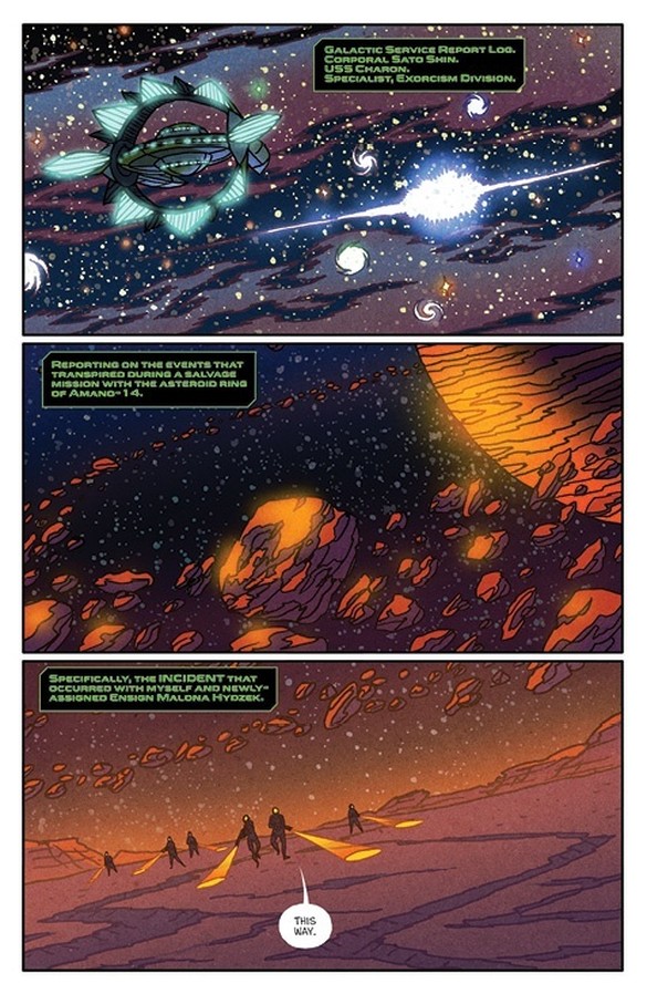 With so much character and ‘stuff’ in here that just chimes and resonates it’s almost as if this series was written for me personally. The idea of diabolic god-powered star drives, or the ship’s mathematicians and exorcists partaking in arcane rituals to ward off space demons is admittedly not going to be everyone’s tastes, but where else will you open with, “Galactic service report log… Exorcism Division”? Even the reader’s letters have folk coming up with short stories and ideas to expand the world after such a short period.