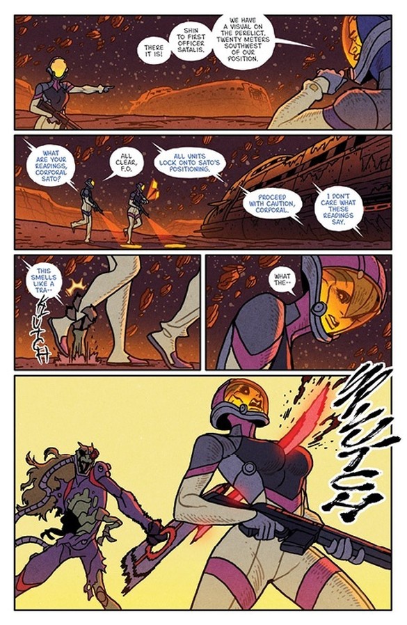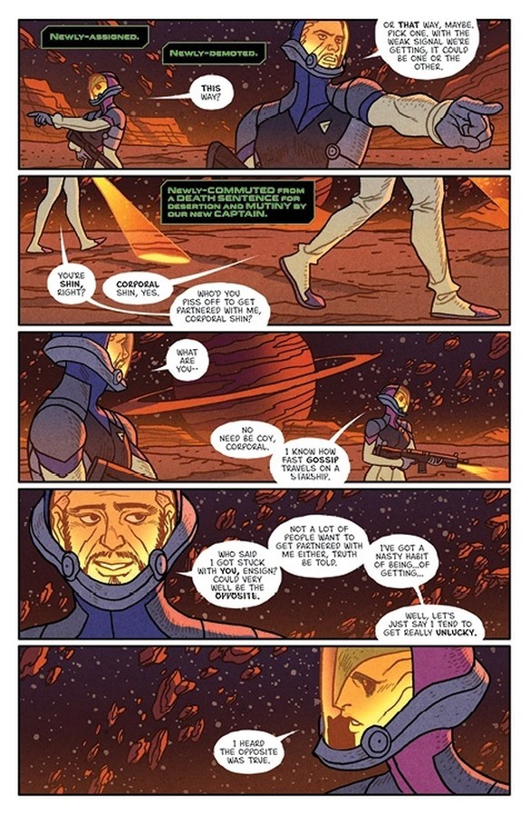 After Riggs taking control of the USS Charon (love the reference) and a somewhat unorthodox testing of the crew’s capabilities, there’s a shift in tempo this issue as we are treated to Outer Darkness’ version of the ‘away team episode’. Of course, being the comic that it is, we’re not going to be cavorting with green women or having highbrow diplomatic negotiations. No, we’re going to have an alien shoot-out and a spot of dubious mercantile salvage works. To cap it all off, there’s also a spot of techno-necromancy which drives some plot revelations, tying up the issue nicely. Taking the time to go off on a little tangent like this gives us opportunity to get to know the supporting cast better and fleshes out the bridge crew and main players.