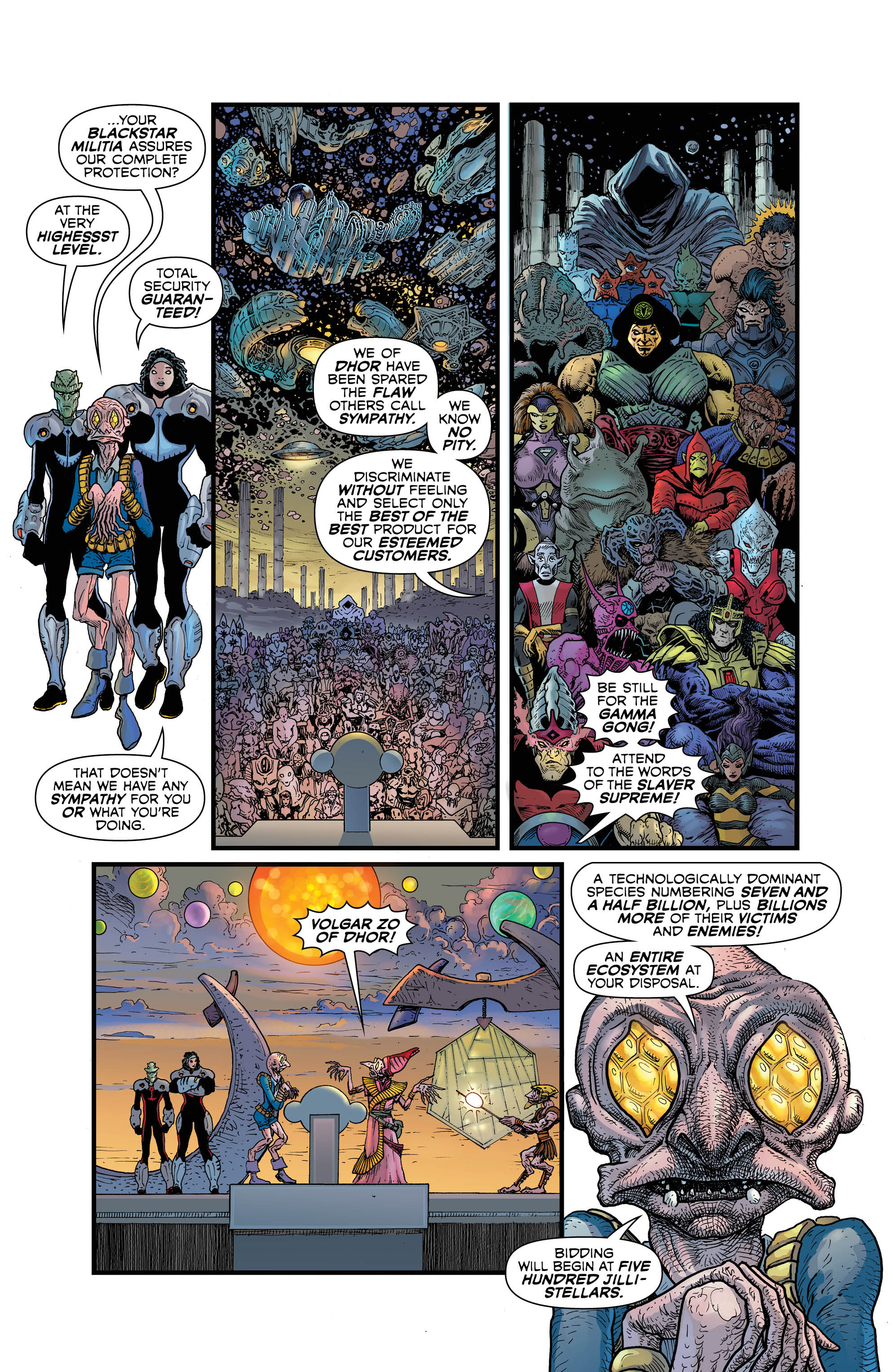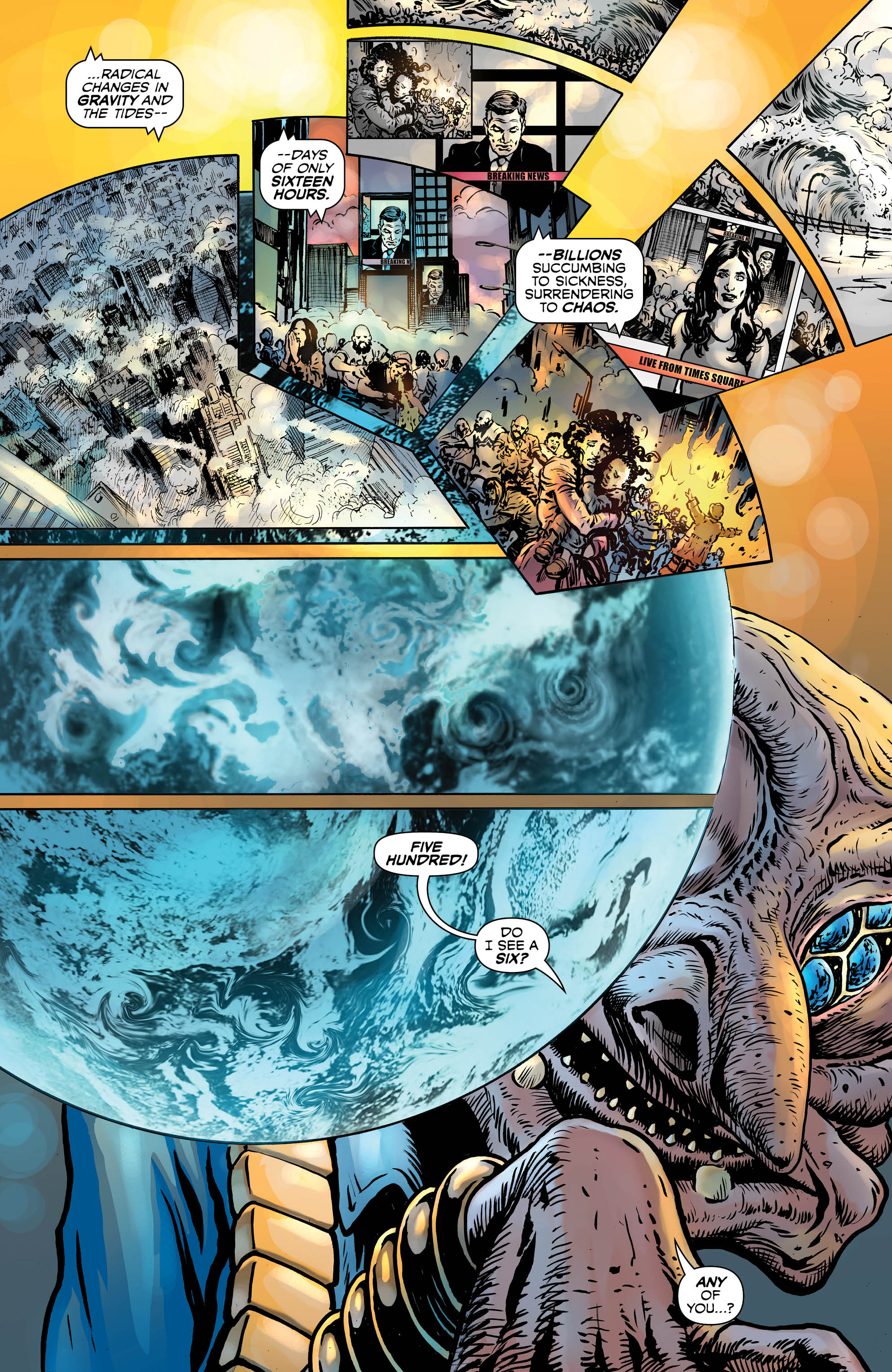 And now, as is customary in my Green Lantern reviews, it’s time to praise both Liam Sharp and Steve Oliff to high heaven. We get some truly inspired panels from Liam here as he takes us from Lovecraftian monsters from the darkest pits of your nightmares to Hal Jordan putting police tape around the planet Earth. It’s amazing to see Sharp handle there wildly different tones in a way that feels consistent, and with his usual splash pages filled with insane ships and Steve Oliff’s phenomenal use of colour, this book is nothing less than a visual masterpiece. Speaking of Oliff, his use of colour is without peer here, from the increased shadows during the book’s darker moments to the bright battles in space between Green Lanterns and Blackstars. Oliff’s work further emphasises all the strengths of Morrison and Sharp’s work and while elevating the book’s quality even higher than it already was.