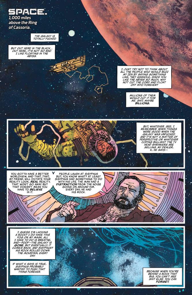 The tone is interesting throughout, mixing dystopian sci-fi with black comedy in a way Tharg himself would be proud of. The back-and-forth dialogue (as well as Billy’s inner monologue) is razor-sharp, with humorous jabs and unobtrusive exposition aplenty, but Moreci still manages to nail the various large-scale dramatic beats that constantly push the story forwards. It’s a series that manages to blend the epic (whole planets literally being destroyed) with the intimate (Billy’s haunted past and reluctance to get involved in the assassination plot) to deliver something truly engrossing.