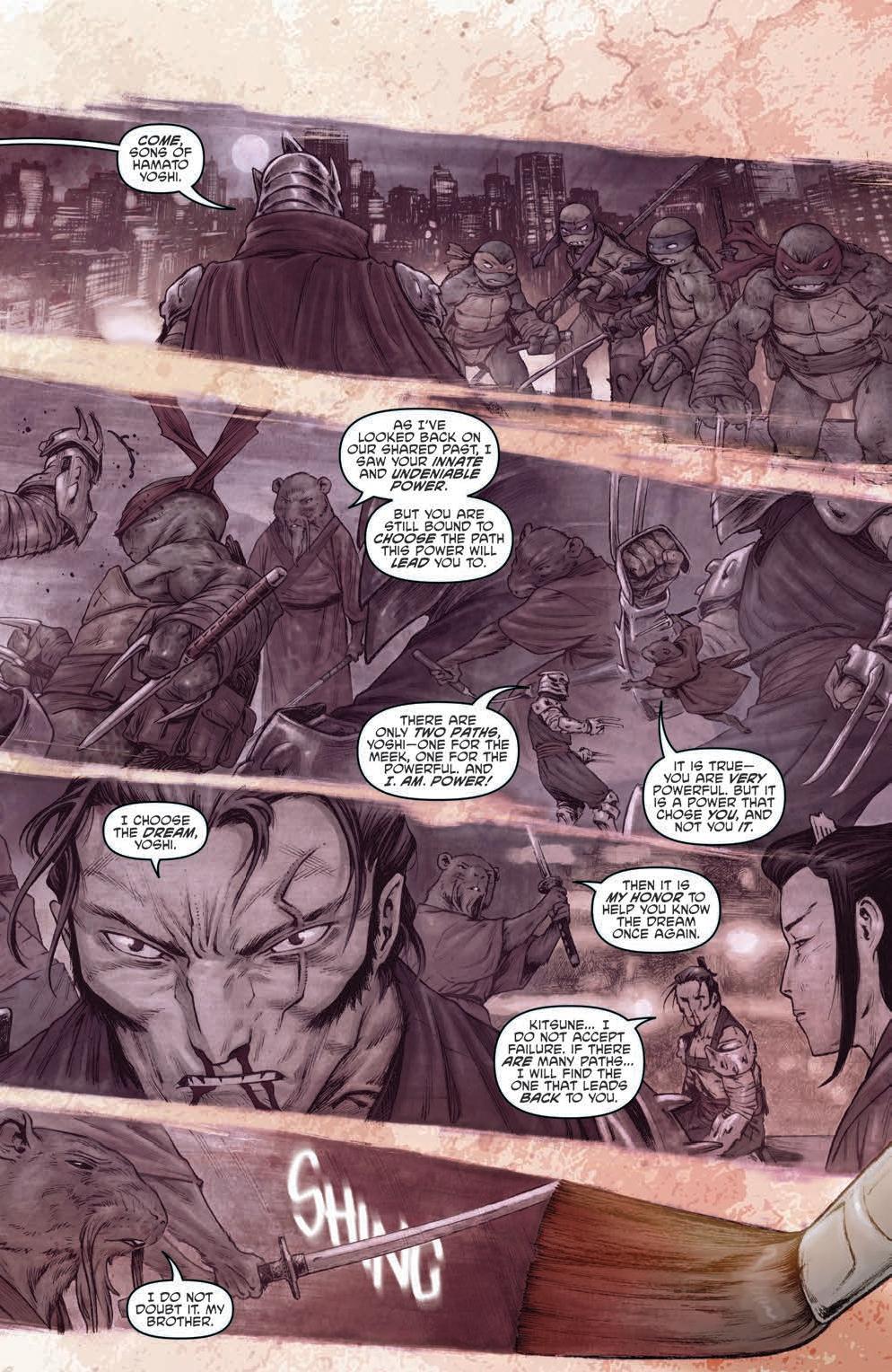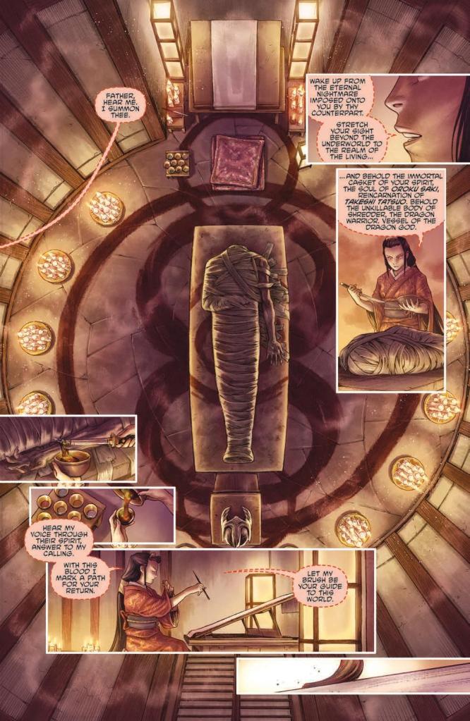 The first thing that grabs you about this series is most definitely the artwork. Santolouco has already left an indelible mark on the world of the Teenage Mutant Ninja Turtles with of his stellar efforts on the main ongoing title and the previous ‘Secret History of the Foot Clan’ mini-series. However, it’s no exaggeration to say that Santolocou’s art has never looked better than it does here, with intricate detail and hazy colours giving the book an aesthetic which is equal parts dynamic and ethereal.