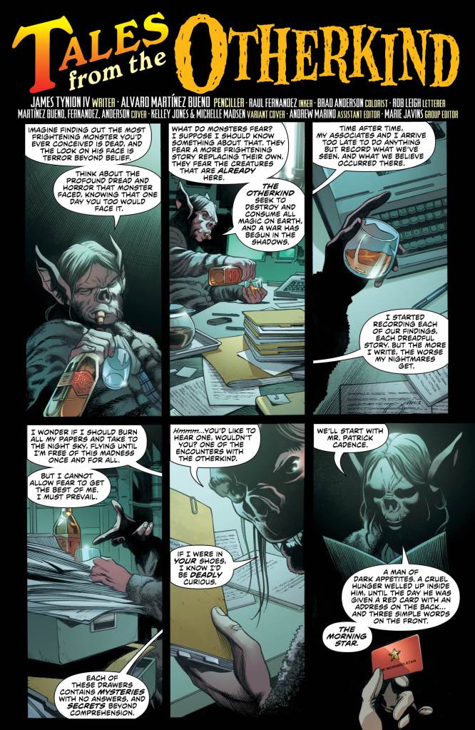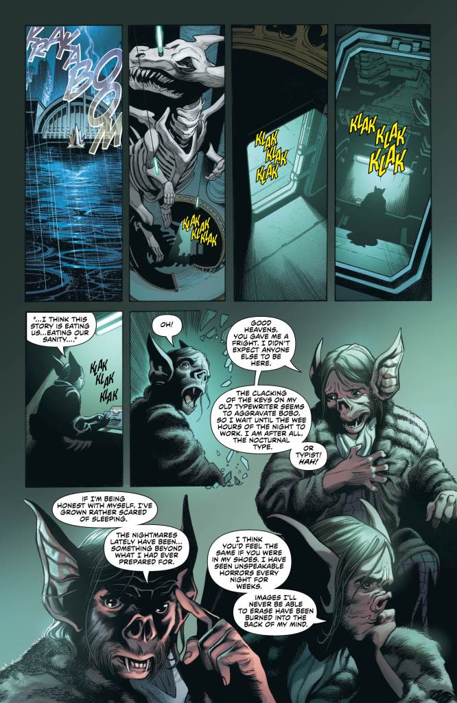 After the brief departure from the main arc in the last few issues the JLD are back on the trail of the Otherkind. Narrated by Man-Bat in his dark and dingy inner sanctum, everything matches those classic ‘80s/early ‘90s shows we all know and love, even down to the lightning bolts lashing outside. Langstrom regales us with three tales of recent events in which we discover that the Otherkind aren’t just biding their time to take the world apart, they’re already here and making quick work of taking down some heavy hitters in the magical world, with the JLD always seemingly one step behind them.
