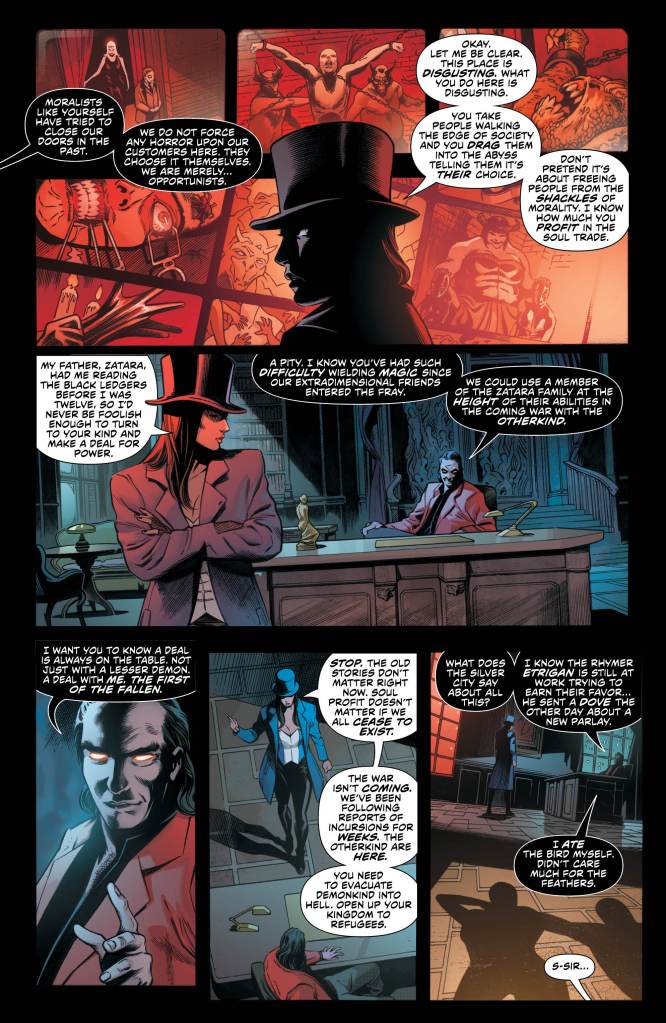 In fact, these odds seemed to be getting to the point where it honestly seems like there’s no way out for a powerless Zatanna, a Swamp Thing cut off from the Green, an out-of-her-depth Amazonian, an alcoholic detective and a reformed bat criminal. However, just when it seems all hope is lost Tynion reveals a hidden gem of back story for Zatanna and the previously unknown truth of her upbringing.