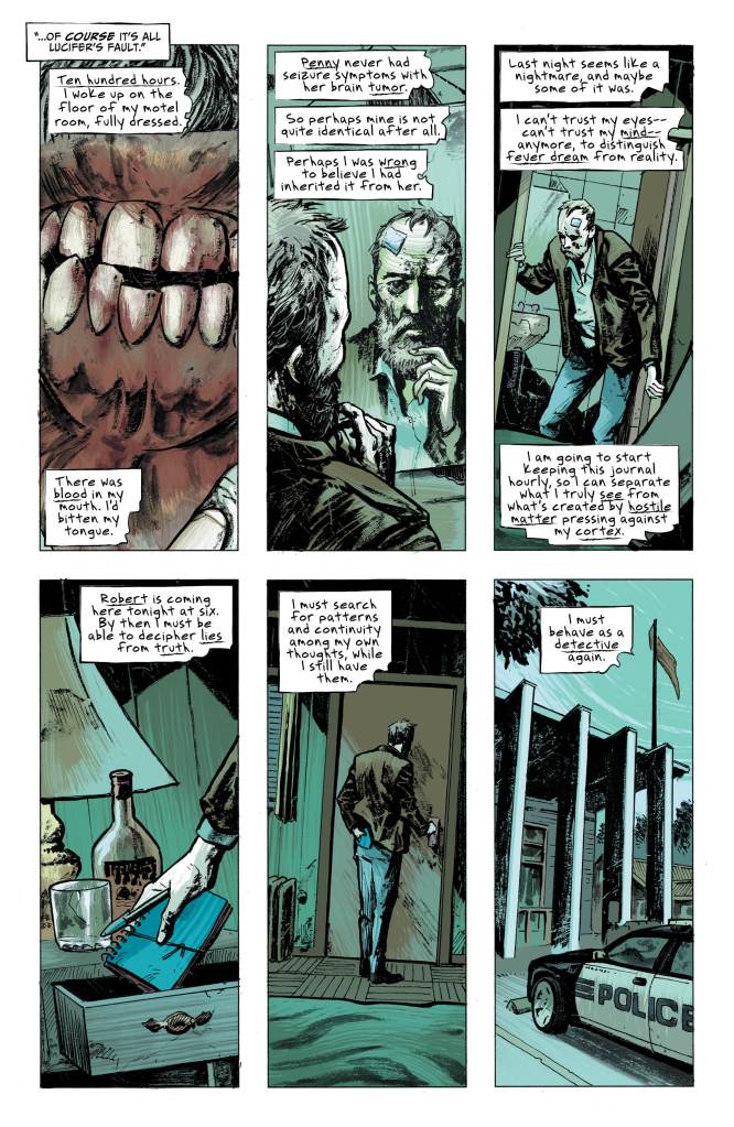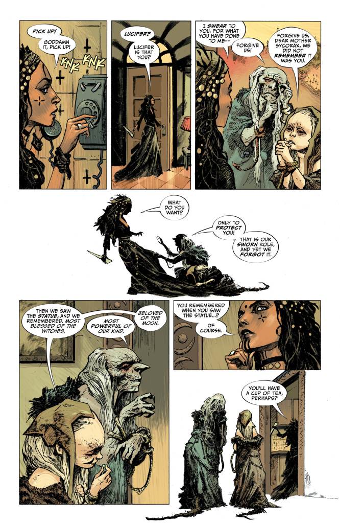 So how did Lucifer end up as the self-blinded beggar on some random plane of existence? Well, as we discover, the duo of witches from his past are the key to bridging this place and the outside world of former detective John Decker. Their search for a third sister mirrors his own search for his wife’s past, resulting in a surprising reveal that offers up even more questions about his grander role in the scheme of things.