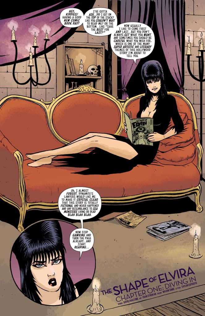 I’ve been a fan of Elvira for decades and I really enjoyed the last series that Dynamite released but I’m going to be honest from the outset and say that this new series isn’t really floating my boat. The basic premise is that Elvira will be working on a movie where the “creature” turns out to be the real deal. The title The Shape of Elvira, pretty much guarantees that if you weren’t already aware by the end of this first issue you’re going to be in no doubt that this is a fairly blatant rip off of The Shape Of Water.
