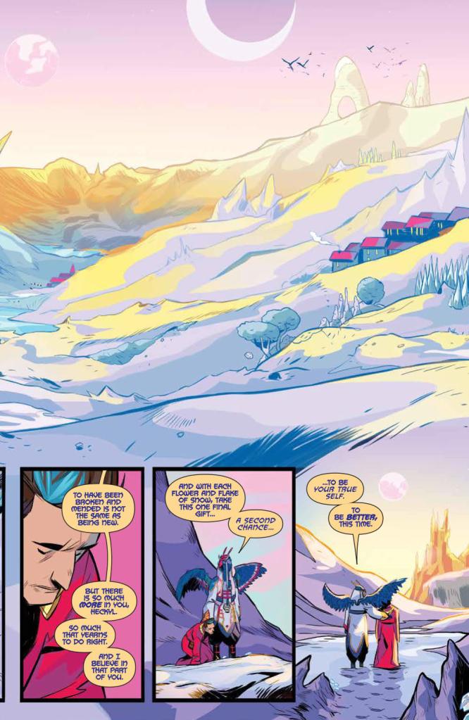 Since the majority of this issue is a flashback, art duties this time fall to French Carlomango, while Francesco Mortarino and Walter Baiamonte cover the scenes set in the present day with their usual quality and skill. Carlomango brings a unique style here which works really well here alongside Elonora Bruni’s colours. The palette features the almost dazzling brightness of a reborn Sentai 6, but isn’t afraid to let the shadows dominate as the story dictates. However, when Bruni’s colours work best is when Carlomango kicks things into high gear in this book’s dramatic and climactic finale. The images and colours on display are simply jaw dropping and I dare not spoil them here.