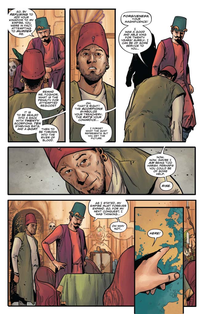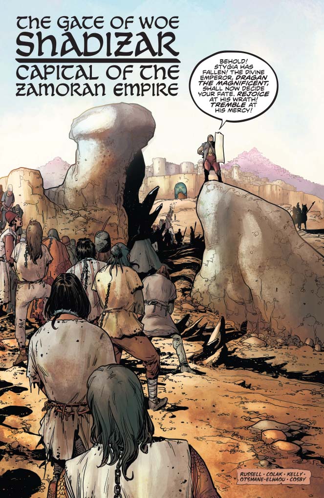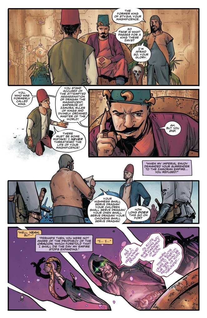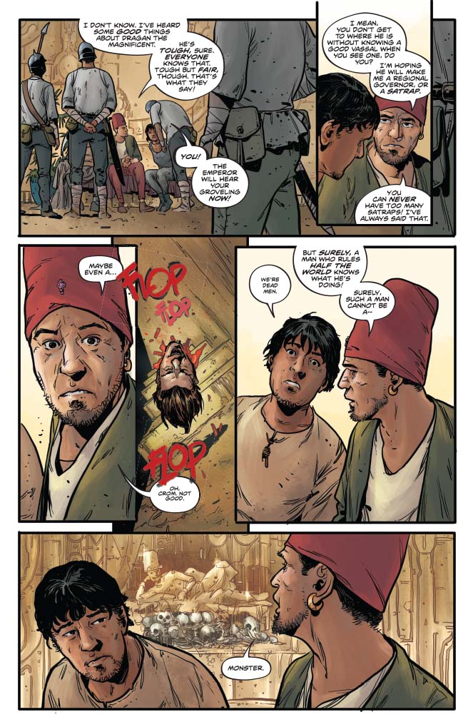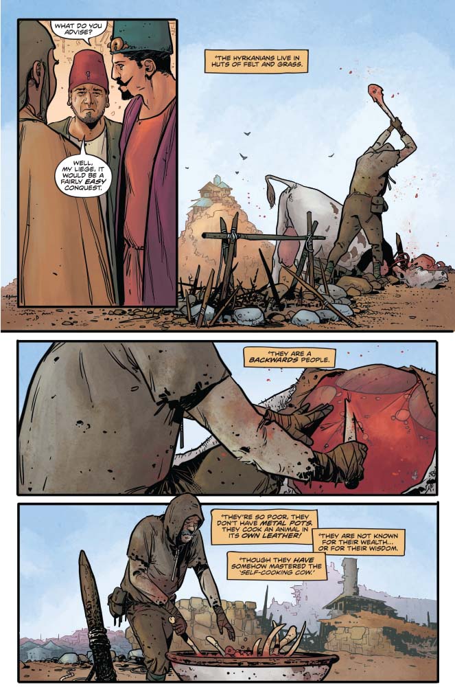 The world Russell gives us in this issue is not as bleak as it could be, and in some respects that works well. There’s a fatalistic humour throughout that I kind of enjoyed but I felt that sometimes it overpowered the story, dragging it into more of a fantasy humour genre. The best/worst example being the letter to Hyrkania from Dragan entitled “So you’ve decided to join the Zamoran Empire”. This was just a step too far for me, and with some of the dialogue being too modern for the genre, I almost expected to see Jason Statham appear in a cameo or a credit to Guy Ritchie at that point. The basics are done right, it’s a solid premise and I thought Sonja was portrayed with much more thought than I’ve seen in other series. On the whole I really enjoyed the story I just think it needs to dial back on the humour a bit.
