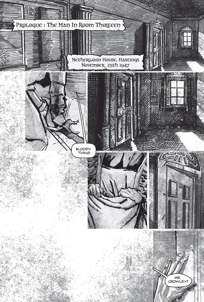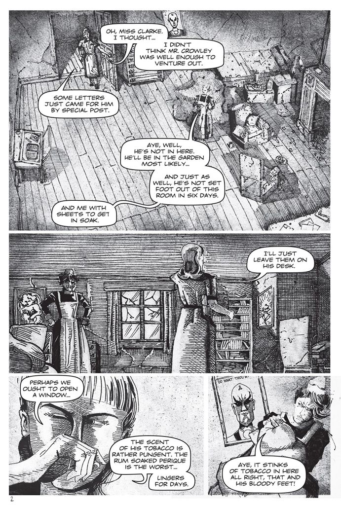That man was Aleister Crowley, a man whose story this beautifully crafted novel from Markosia tells. Set near the end of his life, Aleister is regaling a young author with the story of his life and his descent into the dark arts. What follows is something that mixes nightmarish art, collages of poetry and quotes, historical accuracy and the unknown in-betweens of the man’s life. Frequently blurring the line between reality and what we hope wasn’t true about a life that was dark enough as it is.