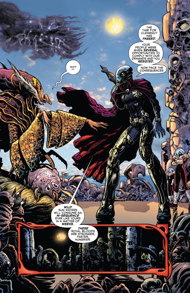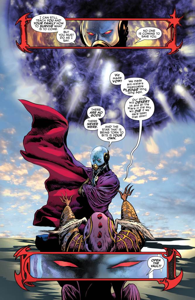 Okay, since I can’t talk too much about the writing it’s time to once again talk about how Liam Sharp and Steve Oliff are at the absolute top of their game here. Every issue I think they’ve reached their peak and every issue I’m proven wrong as they just keep pulling out new tricks. Oliff makes the colour purple look utterly terrifying as Sharp’s Lovecraftian design for the Sun-Eater is dominated with darker blues and purples which contrast spectacularly with the usual green of the Lanterns. Sharp’s work is typically brilliant here too, from a bar scene with a great cameo or two to a battle between galaxies in the sky. It’s truly wonderful, and not a day goes by where I’m not tempted to frame every single panel in this book.
