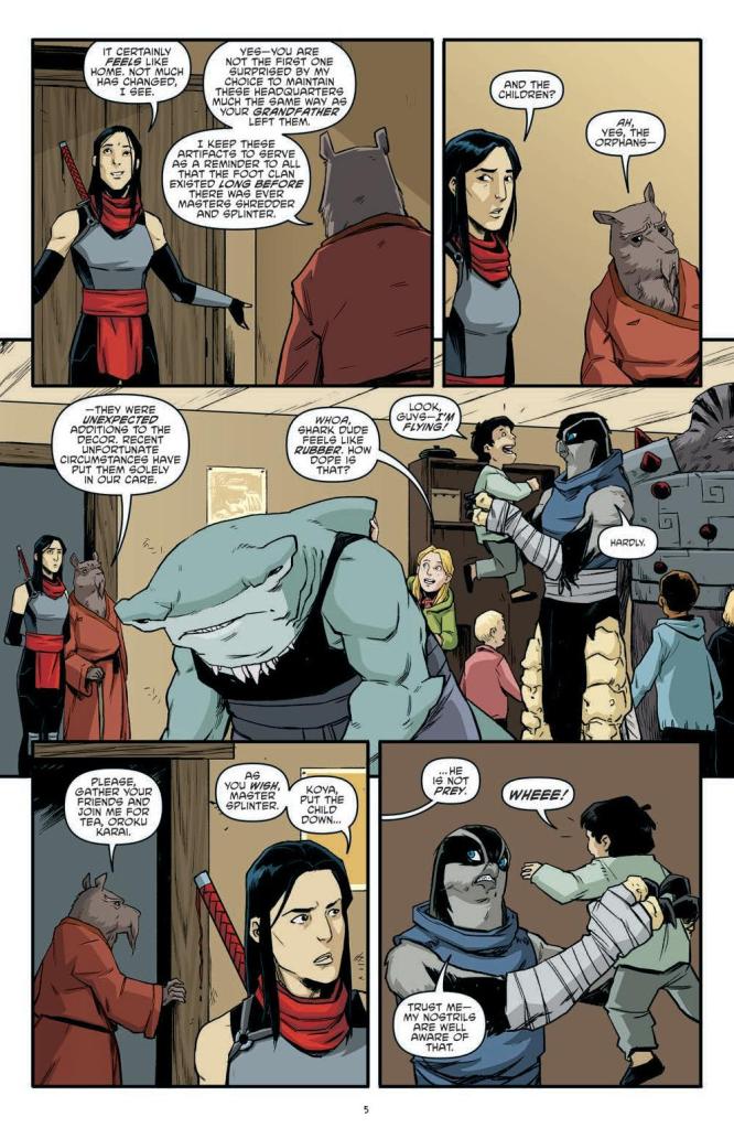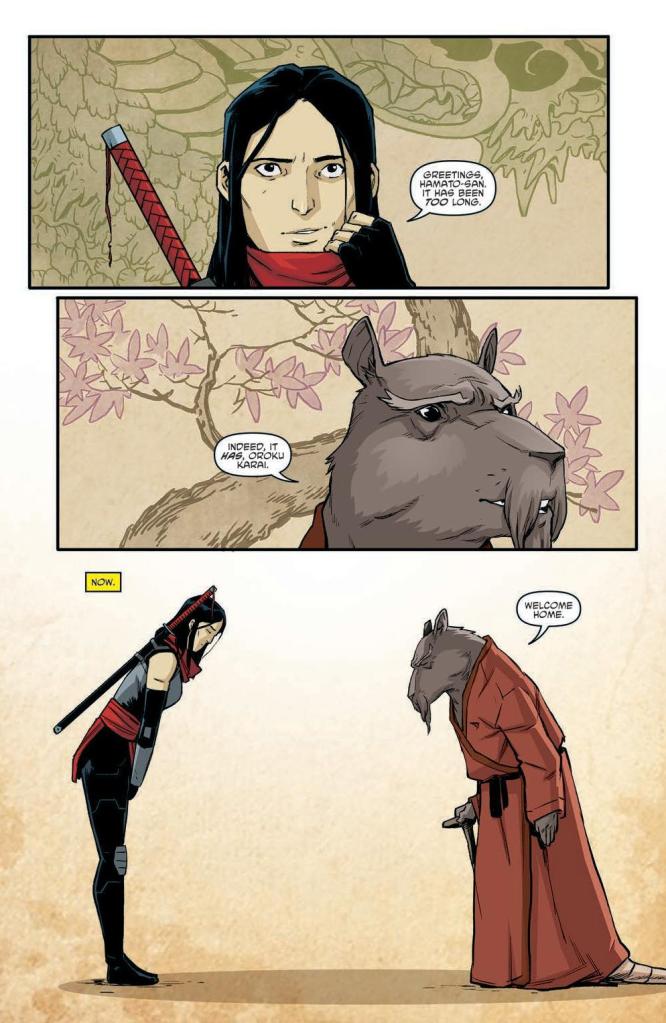 Karai wants to follow in Shredder’s footsteps and take over leadership of the Foot Clan, but she wants to do it in a peaceful, painless fashion. Kitsune clearly has other plans, but Karai’s sense of honour keeps things civil and respectful as she visits Splinter to pay her respects to her late grandfather.