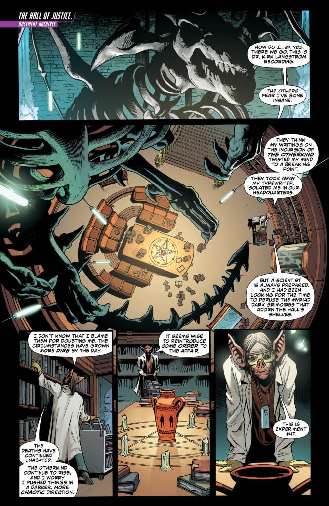 Detective Chimp and Swamp Thing are playing host to the magical refugees of the world who are choosing to run and hide until someone figures something out. However, it looks like they can’t stay hidden for long. Even with the gem passed through the void by her father, and the use of her magical powers back, Zatanna is still two steps behind the Otherkind at all times. And, as we learn from Langstrum, they are the least of our heroes’ worries.