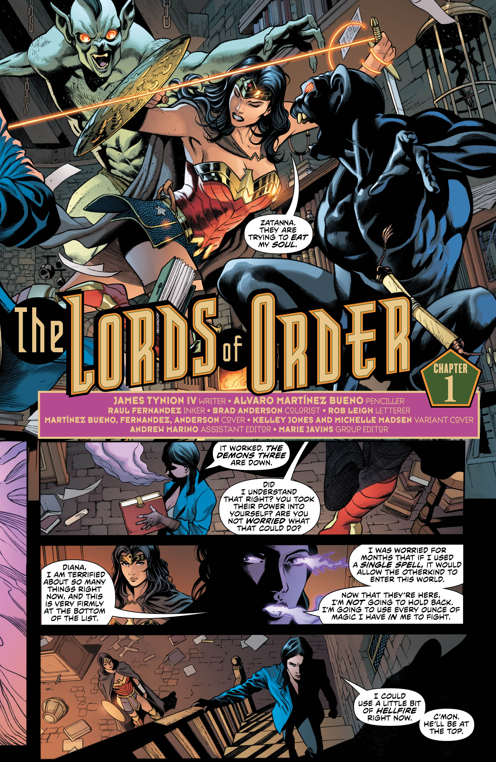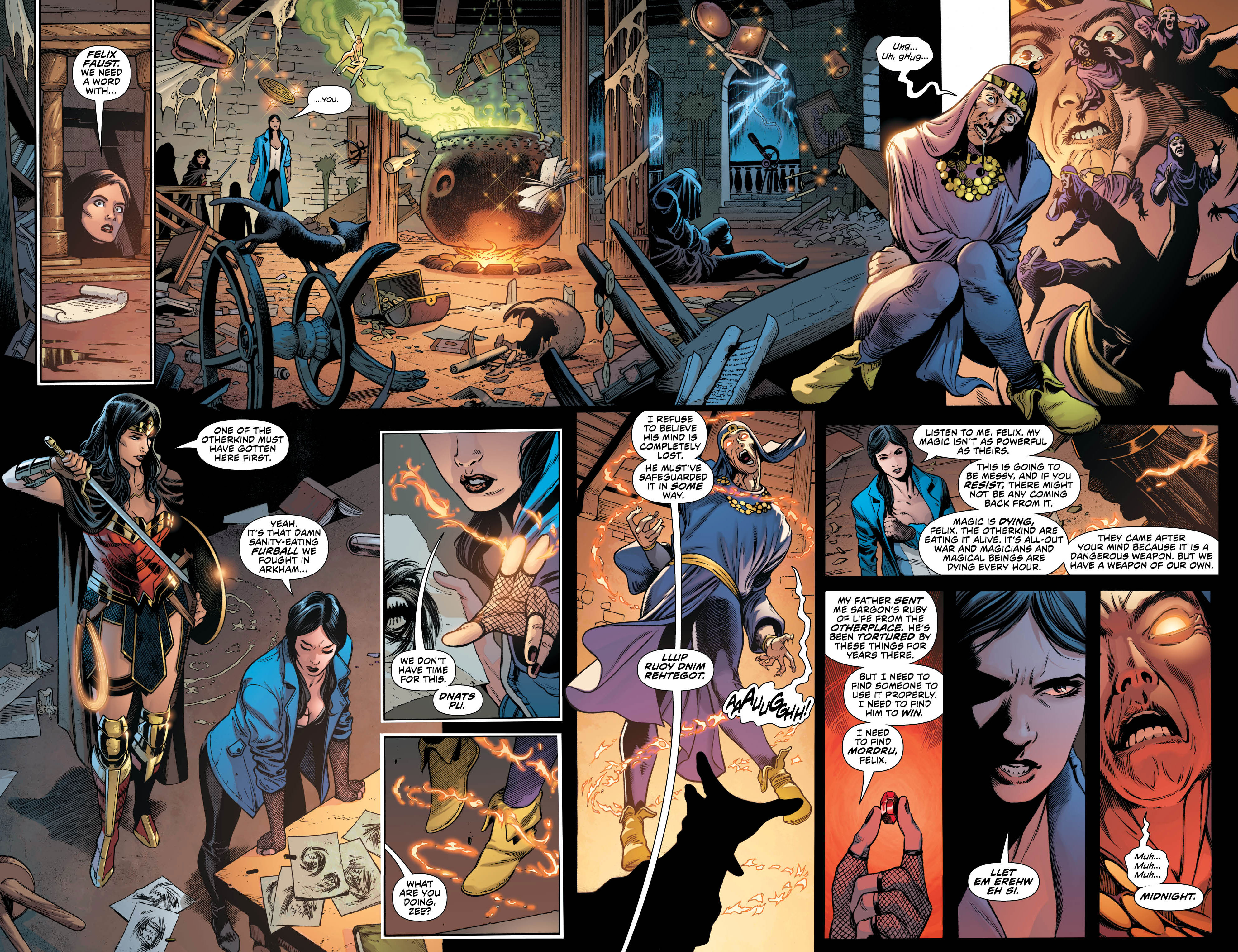 To continue that analogy, this issue is most definitely still in the ‘axe in the face’ phase of James Tynion IV’s story. We open again with Kirk Langstrum still locked away in his study and now trying his hand at magic in another last-ditch attempt to save the day. While he scratches away at a summoning circle, Zatanna and Wondrous Woman are in search of Mordu, an intense magical being to say the least but seemingly their last resort against the encircling dark forces literally eating the magic world alive. In their desperation they meet with an old familiar face, Papa Midnight, another magical figurehead filling his pants against the other kind.