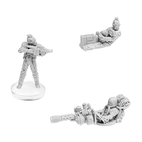 The details are crisp, and there’s not much flash, but I don’t like the bases. I thought I would, because molded bases means no need to buy separate ones, right? Except a couple just sheared in half straight away when removing the excessively thick casting tab, even with a saw. Also, one of the Vesperados was missing the handlebar/headlight. Not terribly difficult to fix, but mas enojadas. The cross bikes come with some great extras – a few billy cans etc – which will more than likely get appropriated for other vehicles. The Choppers are great, but it bugs me slightly that the Cross Bikers and Chopper bikers have different waist/torso joins (the cross are flush, the chopper tab and slot) making it difficult (though not impossible) to mix and match. However, having discussed this with the company, they are going to be interchangeable in future.