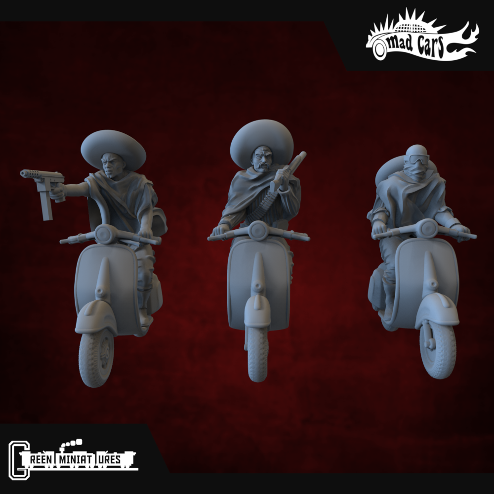 The details are crisp, and there’s not much flash, but I don’t like the bases. I thought I would, because molded bases means no need to buy separate ones, right? Except a couple just sheared in half straight away when removing the excessively thick casting tab, even with a saw. Also, one of the Vesperados was missing the handlebar/headlight. Not terribly difficult to fix, but mas enojadas. The cross bikes come with some great extras – a few billy cans etc – which will more than likely get appropriated for other vehicles. The Choppers are great, but it bugs me slightly that the Cross Bikers and Chopper bikers have different waist/torso joins (the cross are flush, the chopper tab and slot) making it difficult (though not impossible) to mix and match. However, having discussed this with the company, they are going to be interchangeable in future.