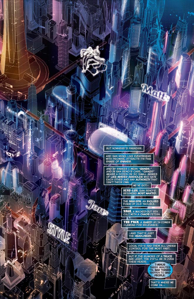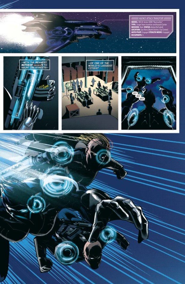 There is the neck end of zero character development in this issue, just a series of characters introduced with a throw away one-liner and a series of explosions. Don’t get me wrong, that’s ok to a point, but for me there’s only so far you can drive a story this way, and to maintain my interest they’re going to have to pull something out of the bag. That being said, the last couple of pages provide an interesting ESCAPE FROM NEW YORK-esque twist that could potentially persuade me to pick up the next issue. I don’t know much about Goff’s previous work but this just feels like there was no real excitement or joy to be had in what he was doing, which is a shame because that twist shows real promise.