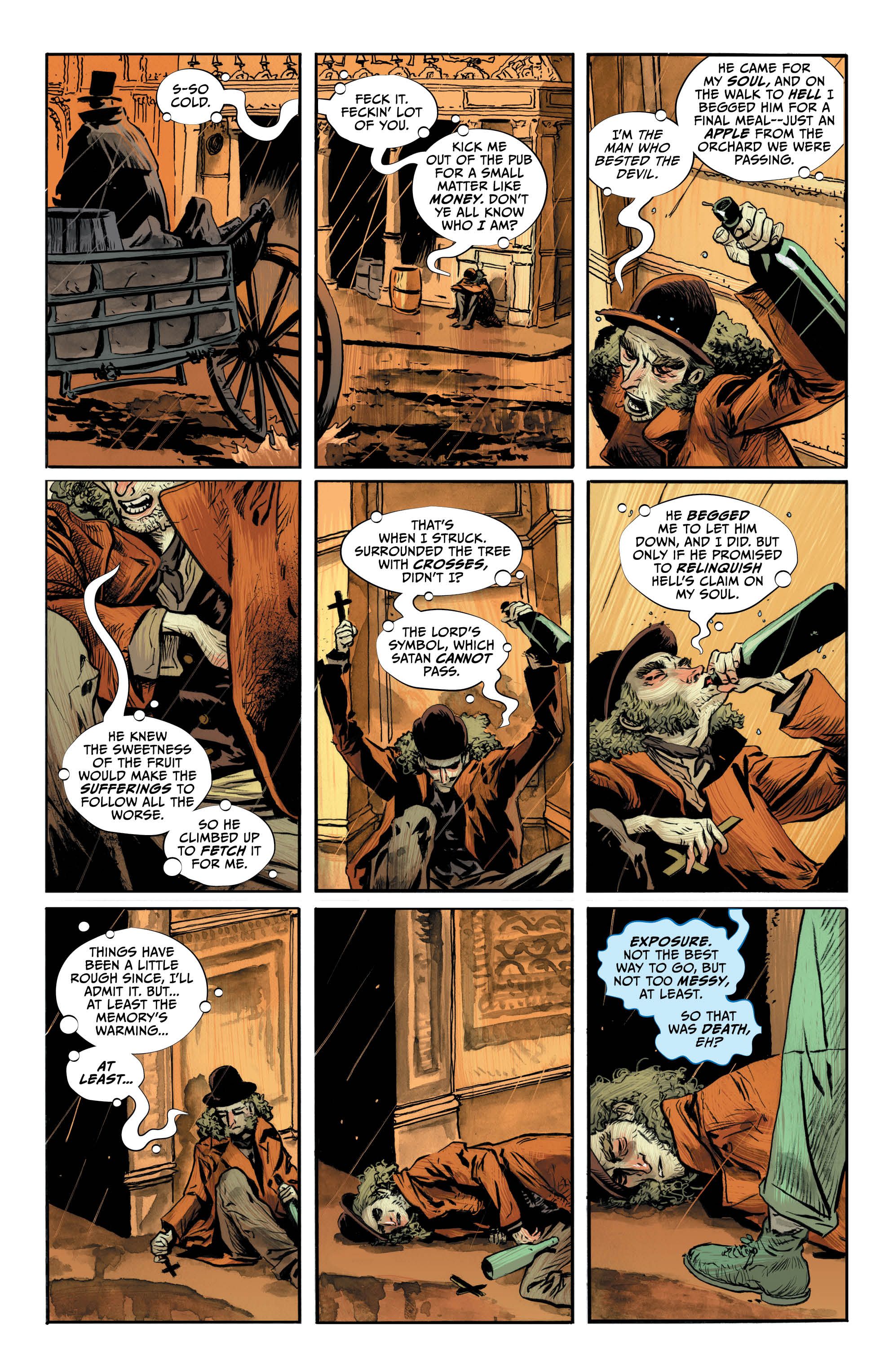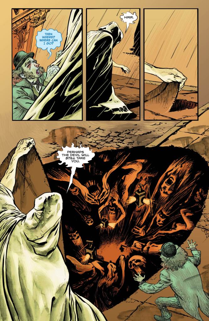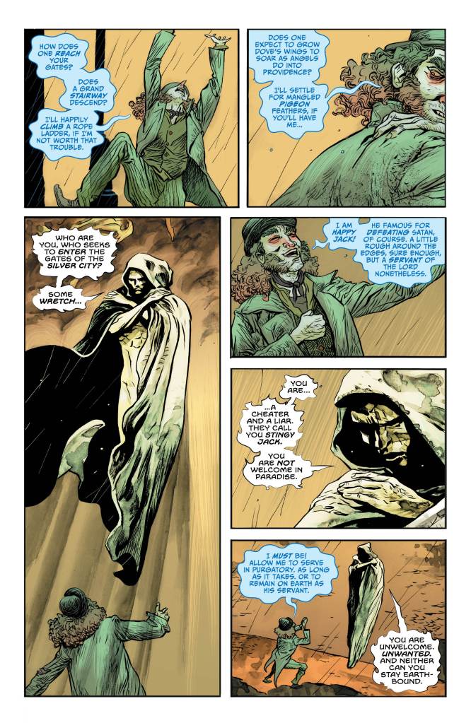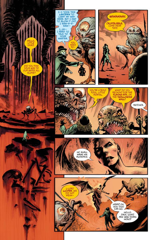 This latest chapter adopts the same narrative style as the previous issues, jumping between flashbacks and the current situation, giving us more and more context for just what the hell is happening (pun intended). As the vicious Jack cuts his extremities off we learn how he once tricked Lucy out of ownership of his own hell. Only when his life ended for a second time did he find out that heaven wouldn’t have him, and as Lucifer knew neither would hell so he spent centuries in the void, completely alone save for a lantern of hell fire to light his way. It wasn’t until he found his way out of the void and into the current realm that he was finally able to seek his revenge. But is the devil as alone as he seems to be, or does he have allies in this strange place of buried memories?