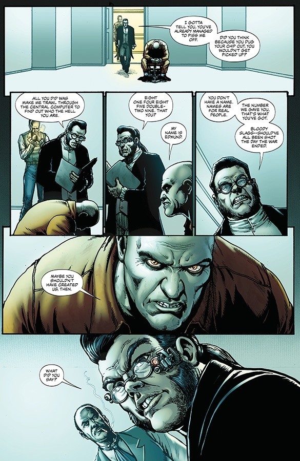 Instead of following on from last month directly, the story jumps a couple of years into the future and gives us an insight into this strange new England. Instead of a Mad Max style Badlands, we see that there is a government of sorts remaining, complete with bespectacled ‘gents’, moustachioed military, and cyber hounds, and the world suddenly becomes wider and more complex. It’s a neat, relatively simple twist which once again forces the story out of any already well-trodden paths; it’s clear though that politics never changes… Our genetic soldiers, now obsolete after the war, are the new working class, however the term slave labour would probably be more apt. With little to no rights, the group are forced to toil in labour camps which young Oliver pleads to see in an attempt to fit in. This builds up to a wonderful take on the, “please sir”, set-piece which is simply stunning.