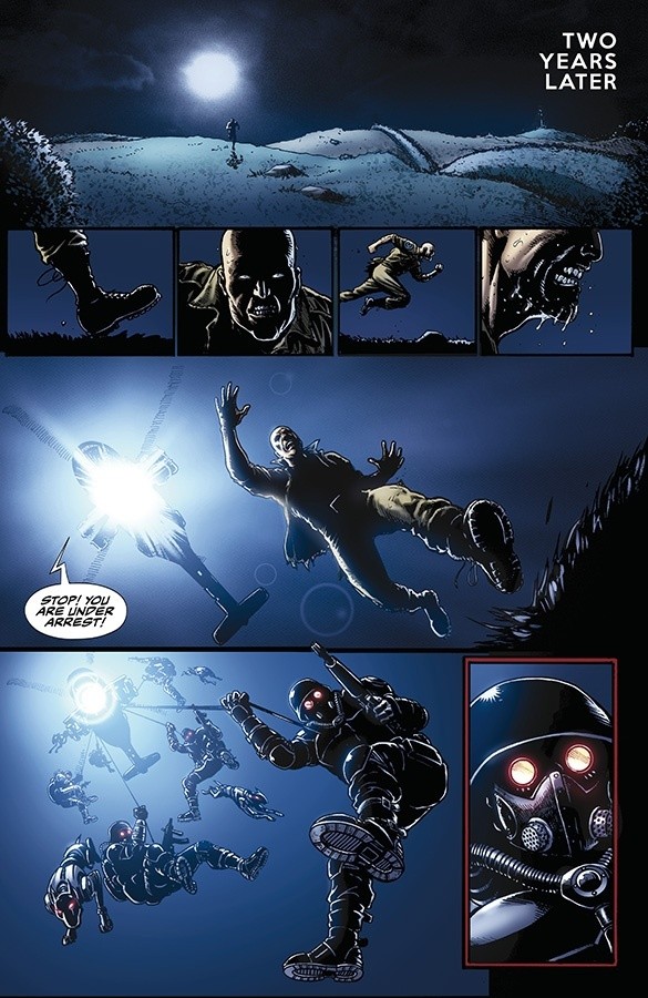 Instead of following on from last month directly, the story jumps a couple of years into the future and gives us an insight into this strange new England. Instead of a Mad Max style Badlands, we see that there is a government of sorts remaining, complete with bespectacled ‘gents’, moustachioed military, and cyber hounds, and the world suddenly becomes wider and more complex. It’s a neat, relatively simple twist which once again forces the story out of any already well-trodden paths; it’s clear though that politics never changes… Our genetic soldiers, now obsolete after the war, are the new working class, however the term slave labour would probably be more apt. With little to no rights, the group are forced to toil in labour camps which young Oliver pleads to see in an attempt to fit in. This builds up to a wonderful take on the, “please sir”, set-piece which is simply stunning.