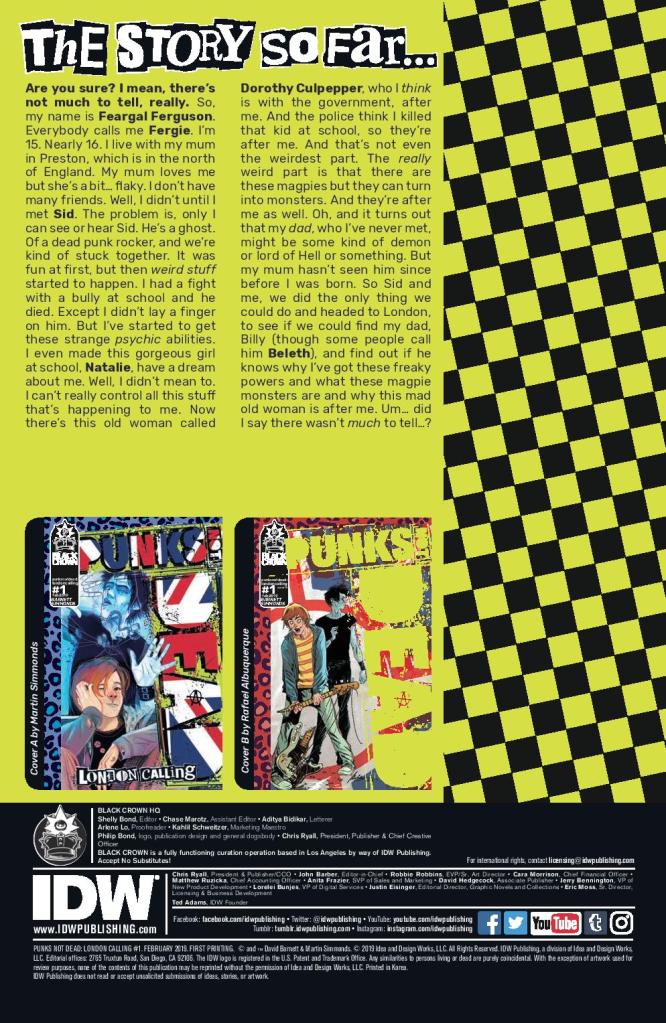 This week marks the return of one of my absolute favourite comics from last year, Punks Not Dead and I couldn’t be happier than to see its return. After the events of volume 1, our newly magically endowed baby punk Fergie is on the run, pursued by the cops in relation to the murder of his bully, chased down by evil magpies and an ancient witchy bitch of a Mod queen from some shady government operation.