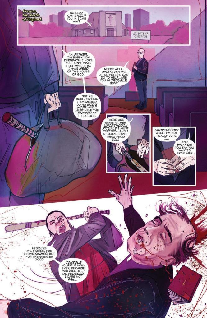 You really can’t get a much more solid opening than a big bloke with crucifixes on his hands bashing in the brains of some poor unfortunate priest, can you?