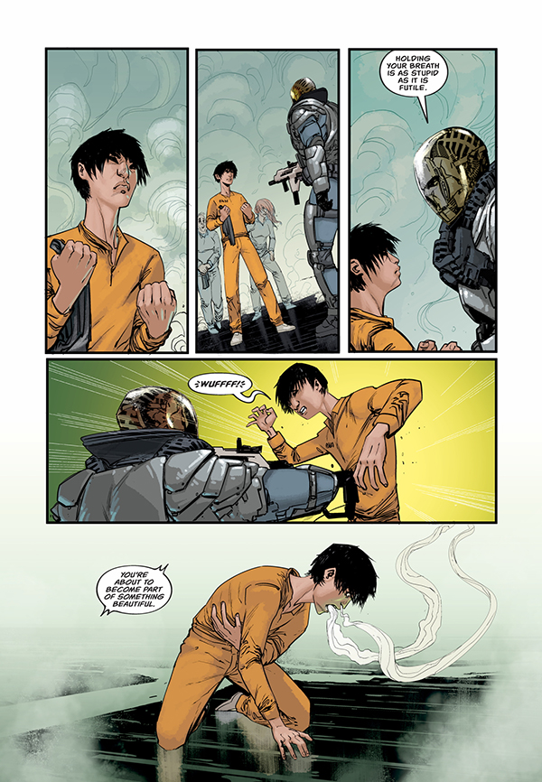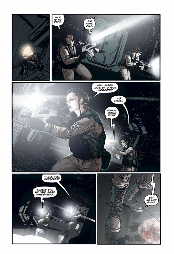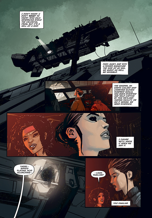 Sadly the artwork is once again as sparse and uninspiring as the dialogue. Whilst it is adequate for the setting, and I do appreciate the high contrast shadow and light in most panels, it lacks the characteristic depth, detail or viscera of better conceived Aliens titles. There’s so much emptiness here.